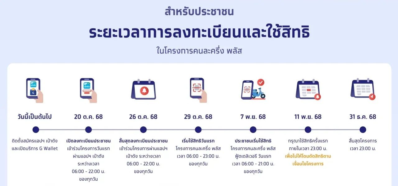 - ผู้ได้รับสิทธิเข้าแอปฯ เป๋าตัง และกดแบนเนอร์โครงการคนละครึ่งพลัส เพื่อเริ่มใช้จ่าย วันที่ 29 ตุลาคม - 31 ธันวาคม 2568 เวลา 06.00 - 23.00 น.