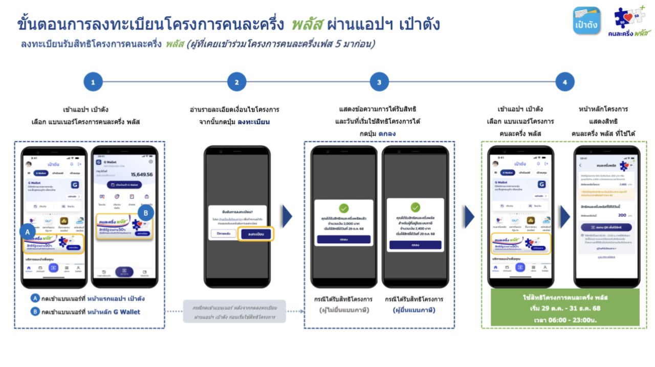 วิธีลงทะเบียน "คนละครึ่งพลัส" ผ่านแอปฯ เป๋าตัง ผู้เคยโครงการคนละครึ่งเฟส 5 จะรู้ผลทันที ส่วนคนลงทะเบียนใหม่จะแจ้งผลภายใน 3 วัน โดยเริ่มใช้สิทธิได้ตั้งแต่ 29 ต.ค. 68 เป็นต้นไป