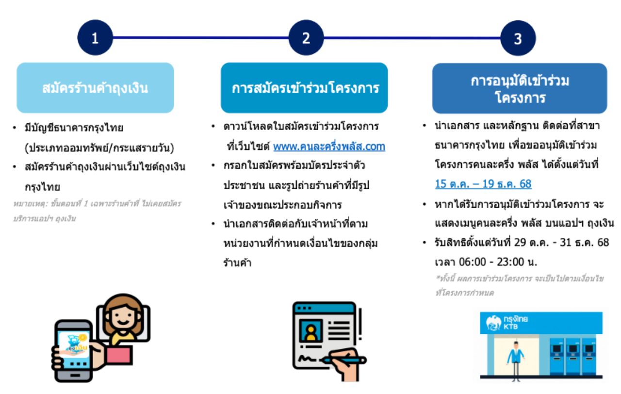 - นำเอกสาร และหลักฐาน ติดต่อที่สาขาธนาคารกรุงไทย เพื่อขออนุมัติเข้าร่วมโครงการคนละครึ่งพลัส ได้ตั้งแต่วันที่ 15 ต.ค. - 19 ธ.ค. 68