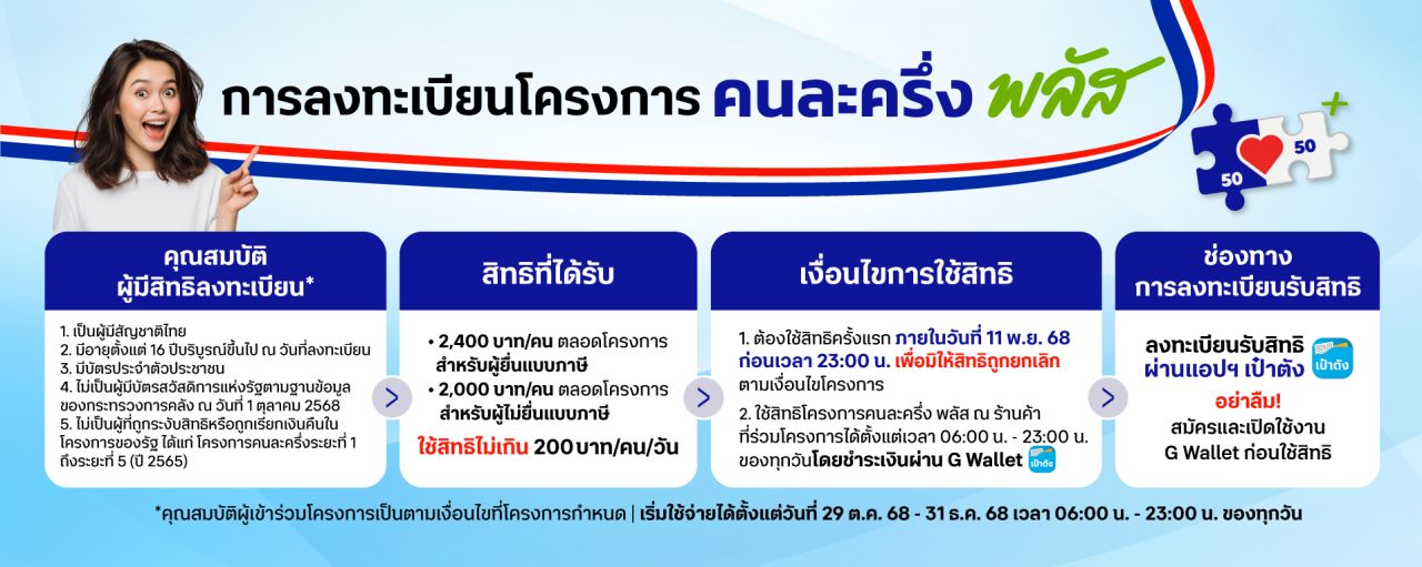 ประชาชนสามารถใช้สิทธิโครงการคนละครึ่งพลัส ได้ตั้งแต่วันที่ 29 ต.ค. - 31 ธ.ค. 68 เวลา 06.00 - 23.00 น. โดยมีรายละเอียดเงื่อนไขดังนี้