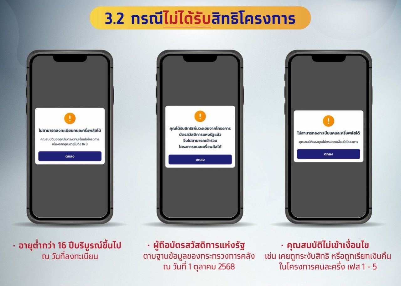 - ผู้ถือบัตรสวัสดิการแห่งรัฐ ตามฐานข้อมูลของกระทรวงการคลัง ณ วันที่ 1 ตุลาคม 2568 : "คุณได้รับสิทธิเพิ่มวงเงินจากโครงการบัตรสวัสดิการแห่งรัฐแล้ว จึงไม่สามารถเข้าร่วมโครงการคนละครึ่งพลัสได้"