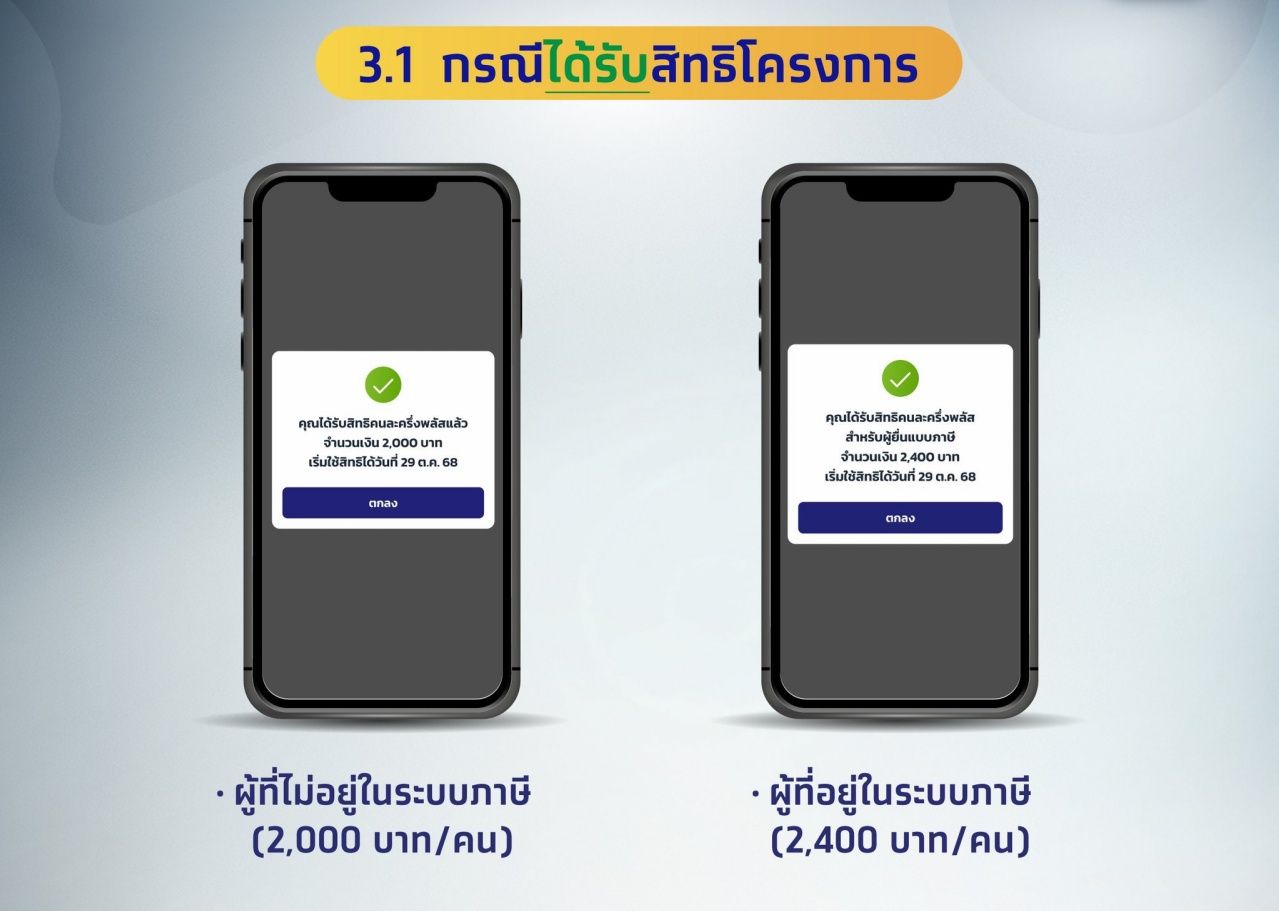 - ผู้ที่ไม่อยู่ในระบบภาษี (2,000 บาท / คน) : "คุณได้รับสิทธิ์คนละครึ่งพลัสแล้ว จำนวนเงิน 2,000 บาท เริ่มใช้สิทธิ์ได้วันที่ 29 ต.ค. 68"