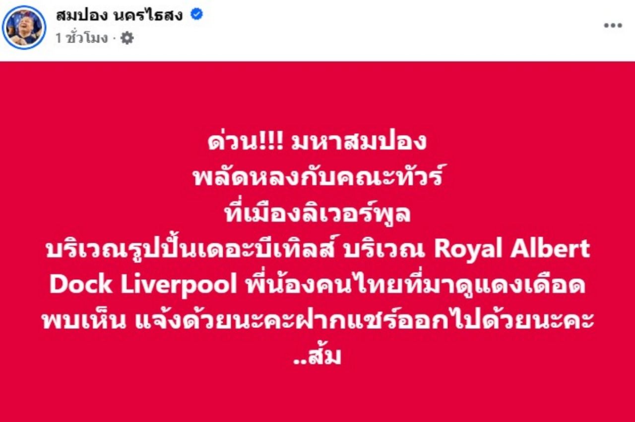 แฟนสาวร้อนใจ ประกาศตามหา "อดีตพระมหาสมปอง" สมปอง นครไธสง พลัดหลงกับคณะทัวร์ที่เมืองลิเวอร์พูล เผย หลายชั่วโมงแล้ว ยังติดต่อไม่ได้