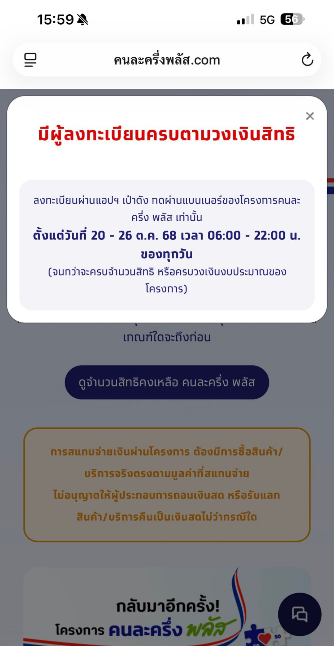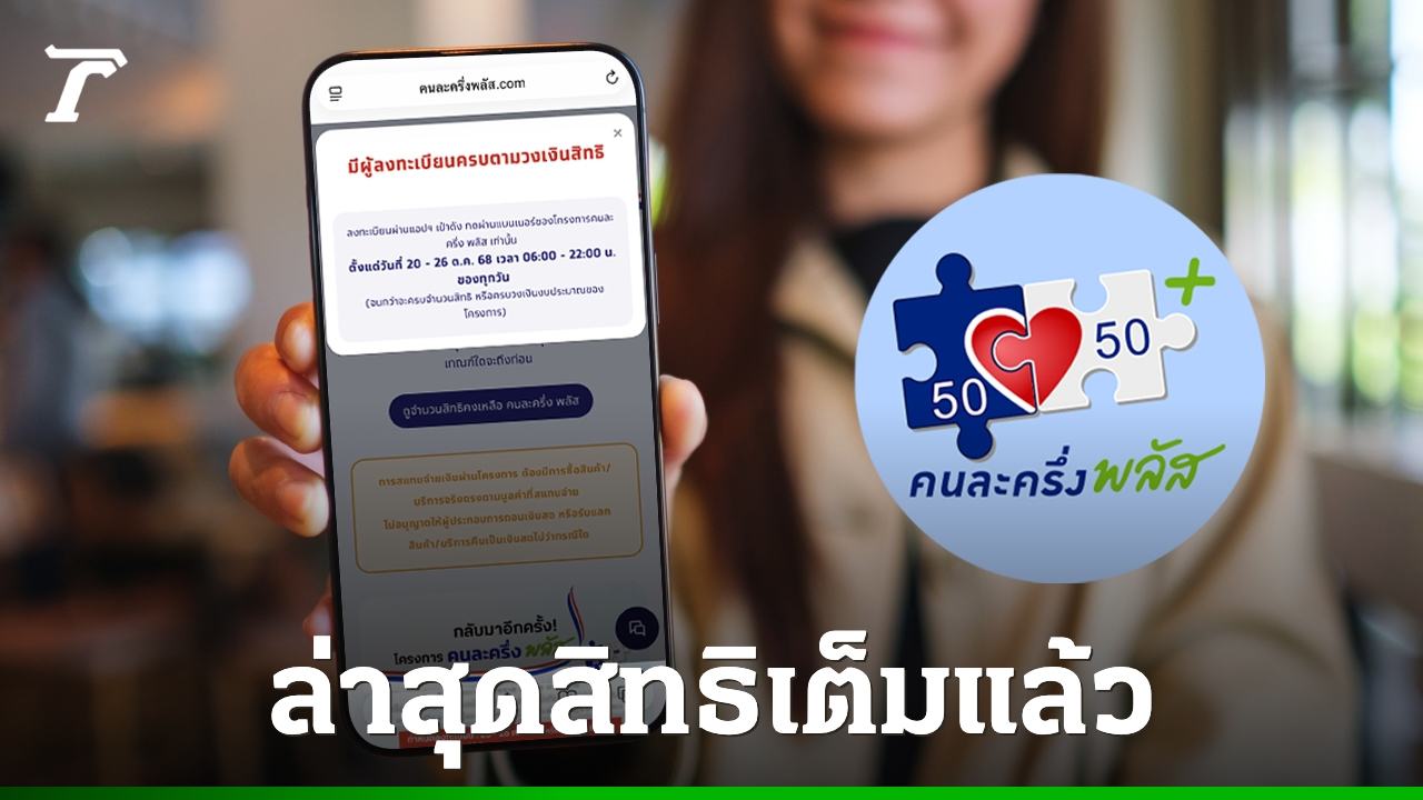 ลงทะเบียนคนละครึ่งพลัส เต็มแล้ว 20 ล้านสิทธิ ย้ำเงื่อนไขการใช้สิทธิสำหรับประชาชน ต้องใช้ครั้งแรกภายในวันที่ 11 พ.ย. 2568