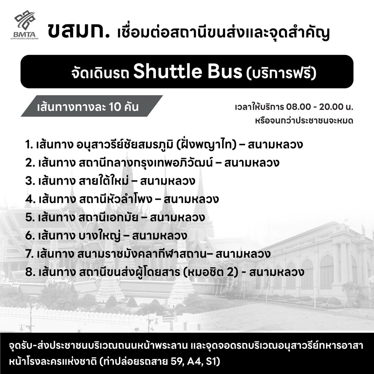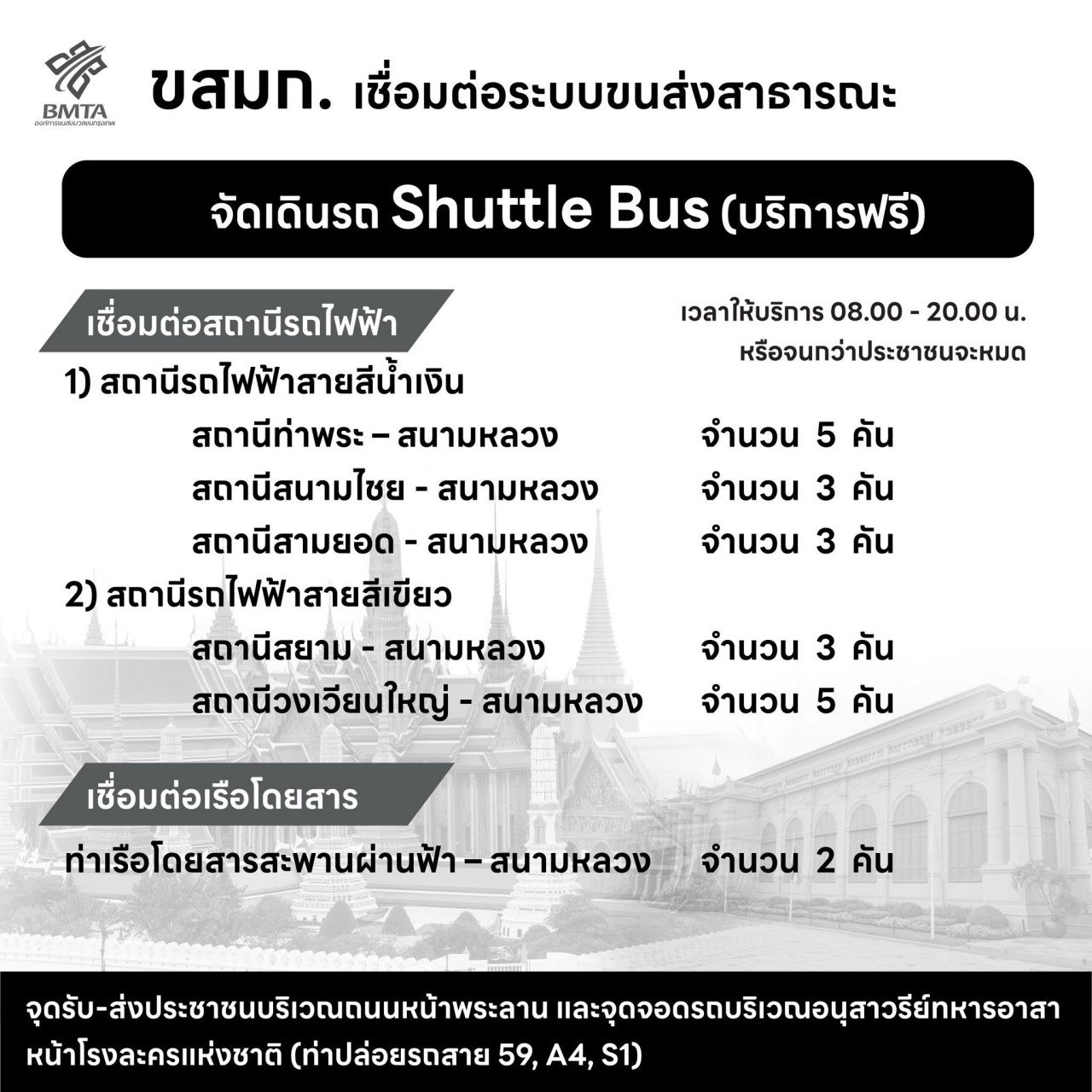 - รถโดยสาร Shuttle Bus (บริการฟรี) เชื่อมต่อสถานีรถไฟฟ้า จำนวน 6 เส้นทาง และ เชื่อมต่อสถานีขนส่ง จำนวน 8 เส้นทาง ให้บริการตั้งแต่เวลา 08.00 – 20.00 น. หรือจนกว่าประชาชนจะออกจากพื้นที่จนหมด