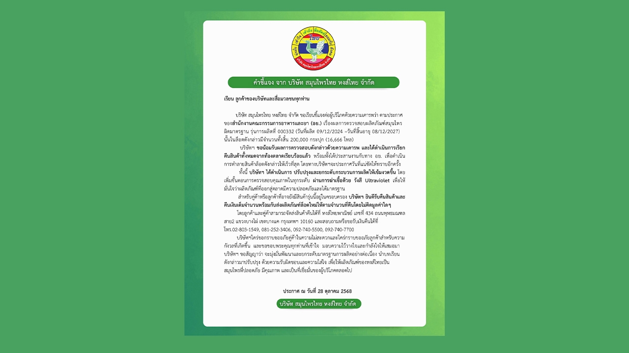 บริษัท สมุนไพรไทย หงส์ไทย จำกัด ขอเรียนชี้แจงต่อผู้บริโภคด้วยความเคารพว่า ตามประกาศของสำนักงานคณะกรรมการอาหารและยา (อย.) เรื่องผลการตรวจสอบผลิตภัณฑ์สมุนไพรผิดมาตรฐาน รุ่นการผลิตที่ 000332 (วันที่ผลิต 09/12/2024 –วันที่สิ้นอายุ 08/12/2027) นั้นในล็อตดังกล่าวมีจำนวนทั้งสิ้น 200,000 กระปุก (16,666 โหล)