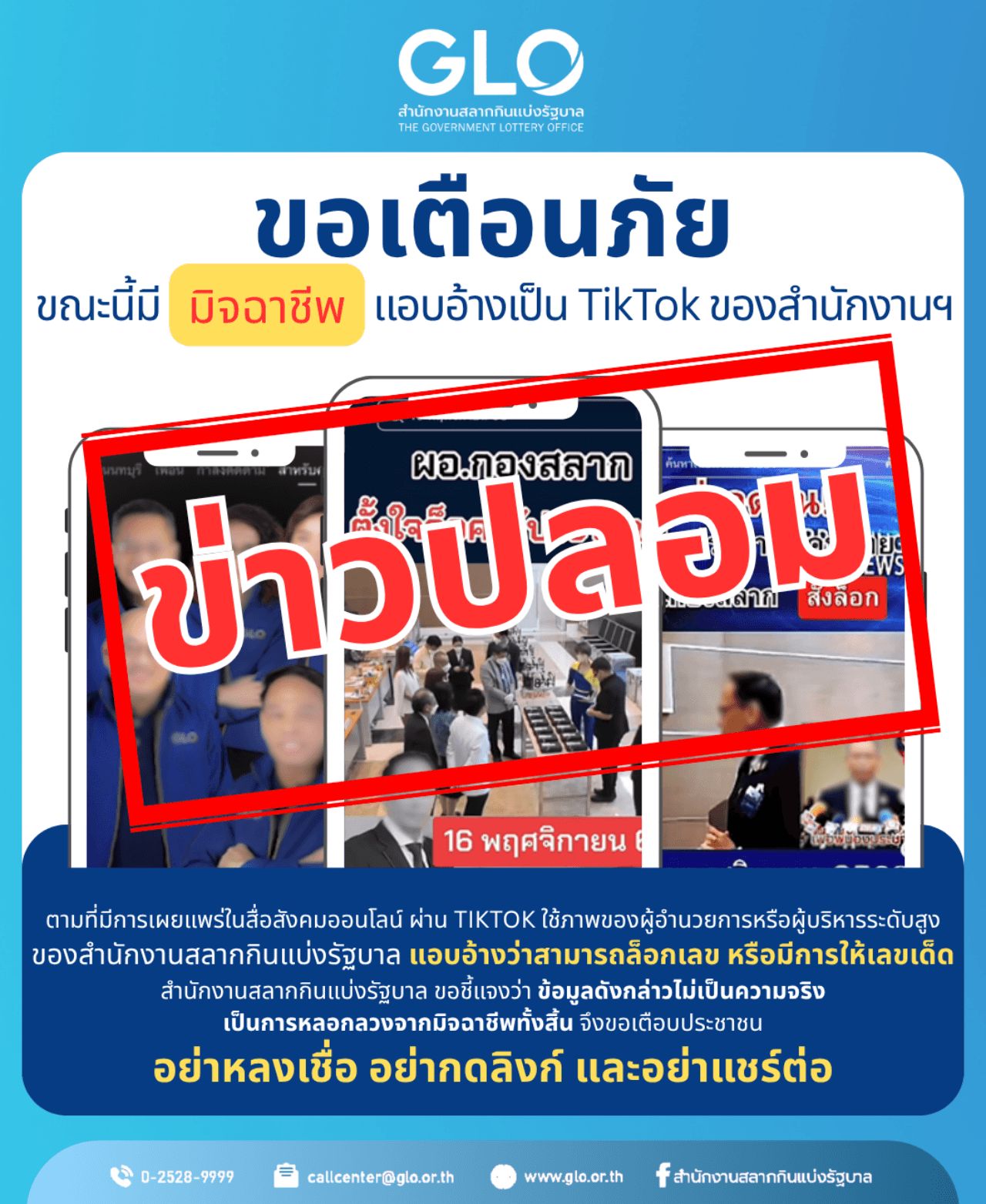 วันที่ 16 พ.ย. 68 สำนักงานสลากกินแบ่งรัฐบาล (GLO) ขอเตือนพี่น้องประชาชน ระวังมิจฉาชีพแอบอ้างชื่อผู้บริหารของสำนักงานฯ หรือดัดแปลงภาพ เสียง ผู้บริหารสำนักงานฯ ด้วย AI และนำไปเผยแพร่บนแพลตฟอร์ม TikTok โดยมีเนื้อหาชวนเชื่อให้เลขล็อก-เลขหลุด ผลการออกรางวัลได้