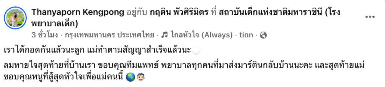 ขณะที่เฟซบุ๊ก Thanyaporn Kengpong ซึ่งเป็นคุณแม่ของน้องมาร์ติน ได้โพสต์ภาพกอดลูกชาย พร้อมข้อความว่า “เราได้กอดกันแล้วนะลูก แม่ทำตามสัญญาสำเร็จแล้วนะ ลมหายใจสุดท้ายที่บ้านเรา ขอบคุณทีมแพทย์ พยาบาลทุกคนที่มาส่งมาร์ตินกลับบ้านนะคะ และสุดท้ายแม่ขอบคุณหนูที่สู้สุดหัวใจเพื่อแม่คนนี้”