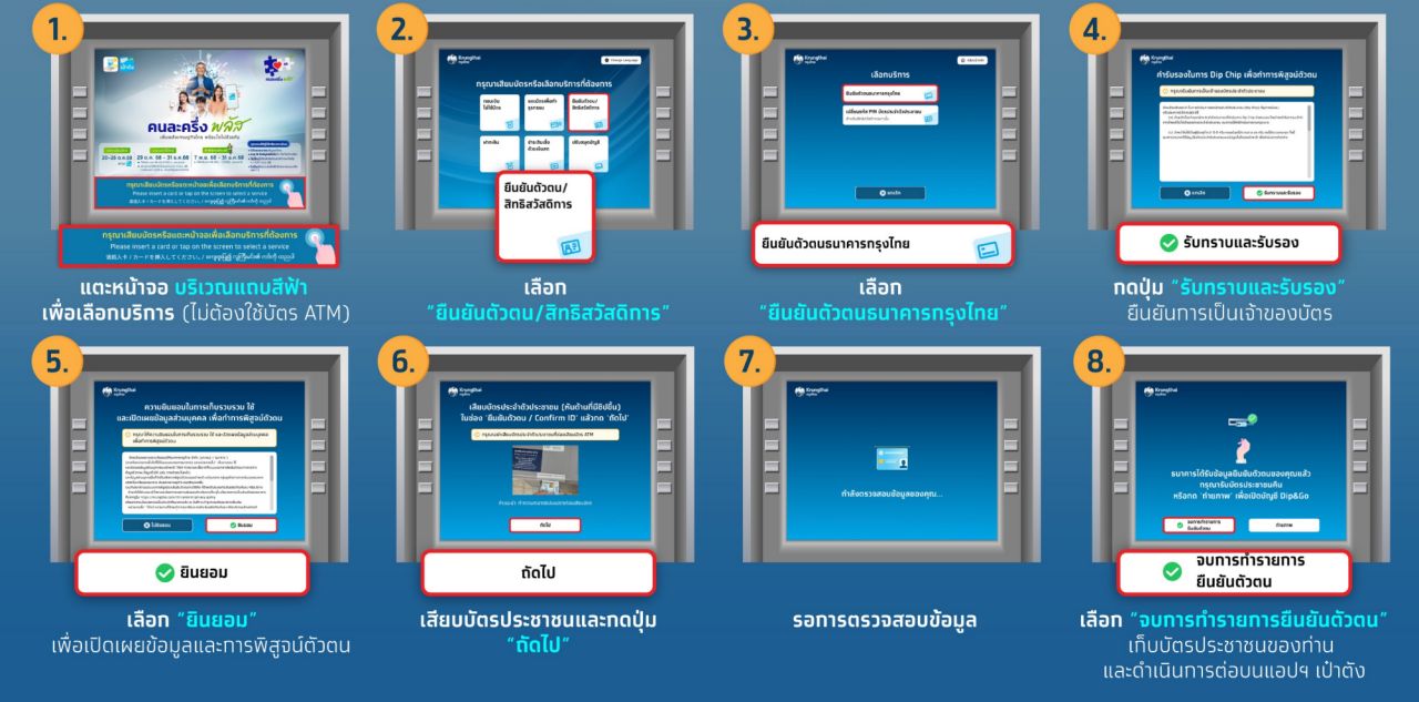 ยืนยันตัวตนผ่านตู้ ATM ธนาคารกรุงไทย (ATM สีเทา) หน้าจอแบบไม่มีปุ่มด้านล่าง