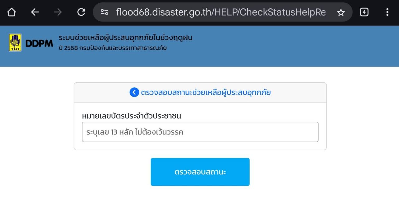 - คลิกแถบสีเขียว "ติดตามสถานะการช่วยเหลือผู้ประสบอุทกภัย ช่วงฤดูฝน 2568"