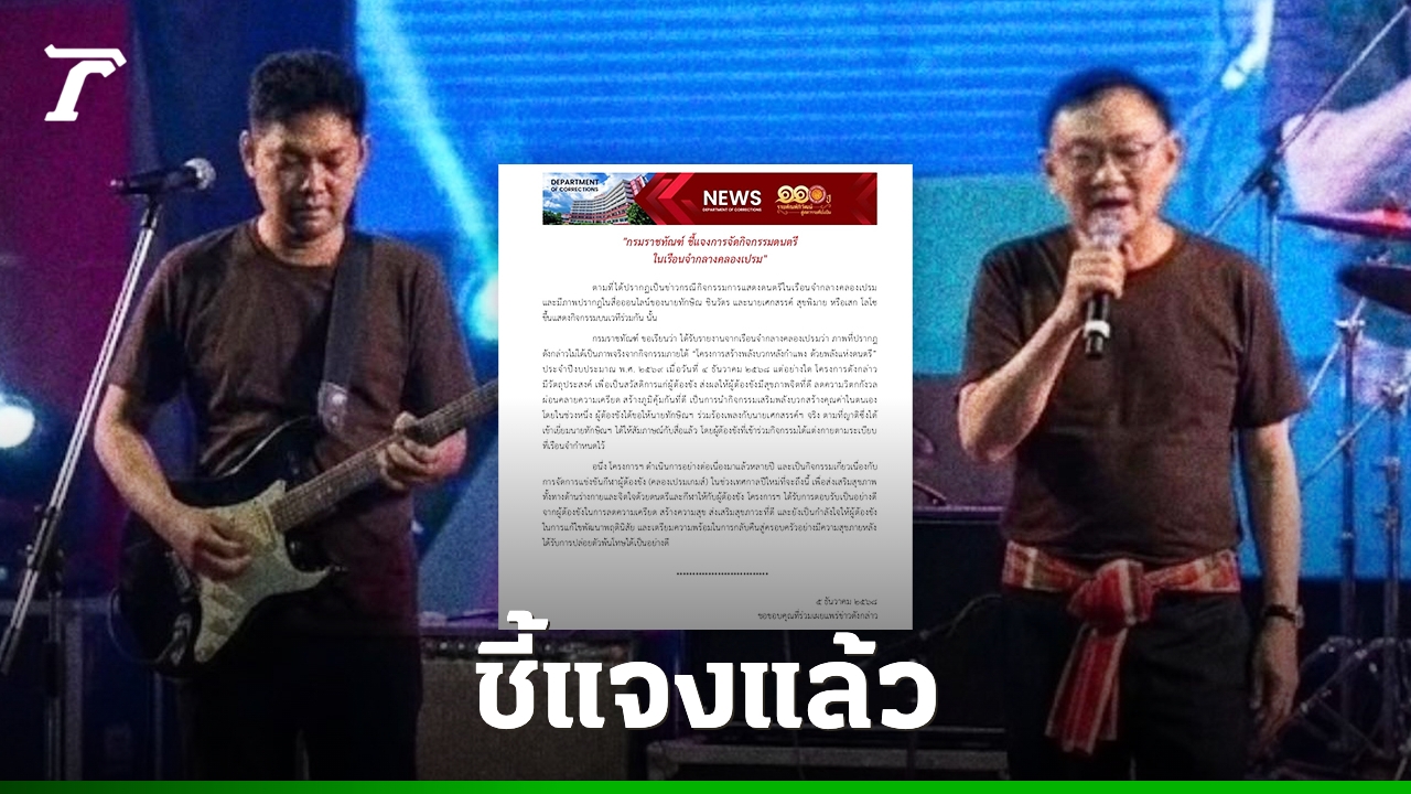 วันที่ 5 ธ.ค. 68 กรมราชทัณฑ์ชี้แจงกรณีกิจกรรมการแสดงดนตรีในเรือนจำกลางคลองเปรมและมีภาพปรากฏในสื่อออนไลน์ของนายทักษิณ ชินวัตร และนายเศกสรรค์ สุขพิมาย หรือเสก โลโซ ขึ้นแสดงกิจกรรมบนเวทีร่วมกัน นั้น