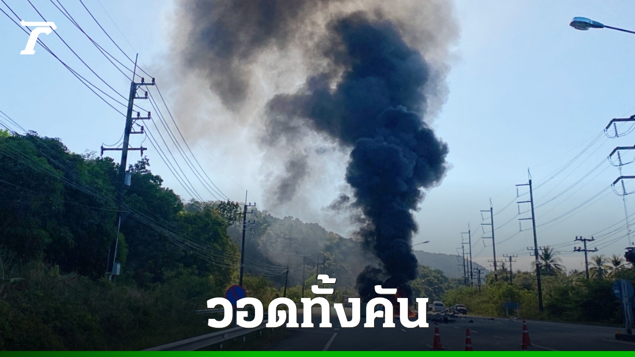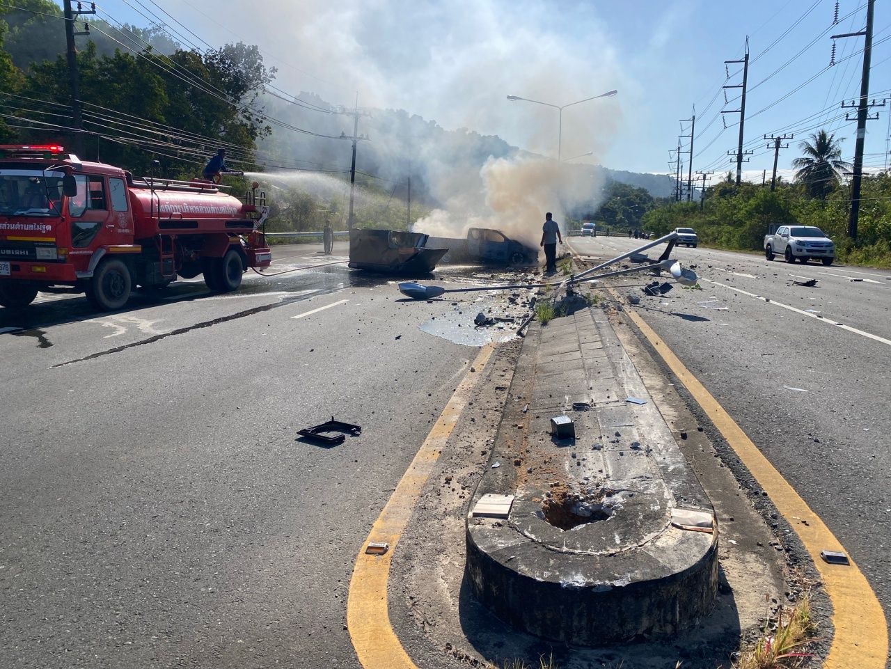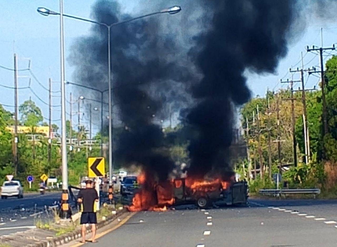 กระบะส่งของบริจาคให้ทหาร พุ่งชนเสาไฟฟ้าเกิดไฟลุกท่วมวอดทั้งคัน โชคดีช่วยออกจากรถทัน ได้รับบาดเจ็บเล็กน้อย คาดหลับใน
