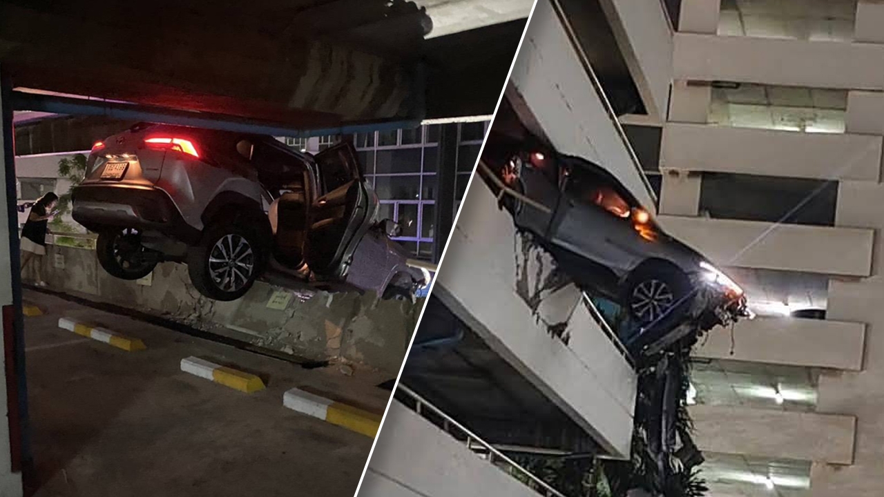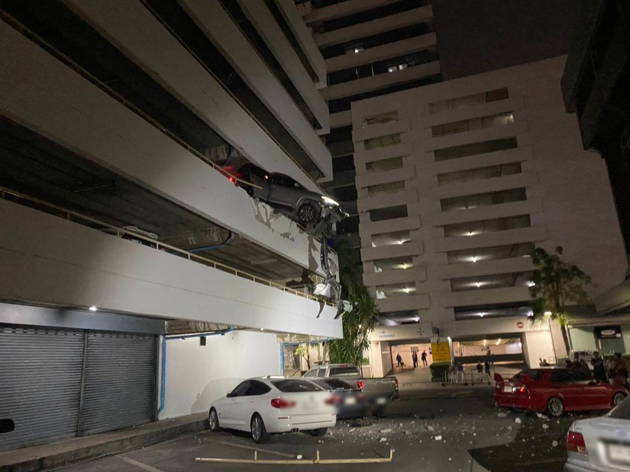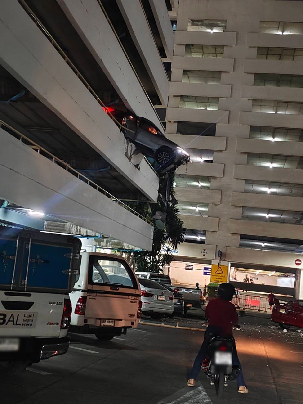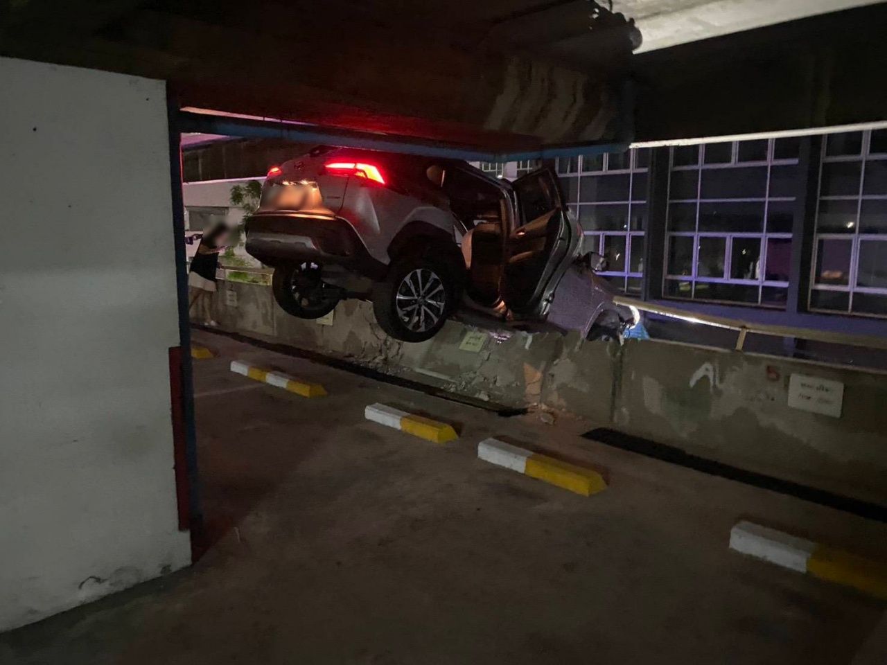 ที่เกิดเหตุเป็นอาคารจอดรถ สูง 7 ชั้น บริเวณชั้นที่ 2 พบรถยนต์ ยี่ห้อโตโยต้า โคโรลล่า ครอส สีเทา ทะเบียนกรุงเทพมหานคร สภาพพุ่งทะลุกำแพงปูนอยู่บนขอบอาคารจอดรถ สร้างความหวาดเสียวให้กับผู้พบเห็นเป็นอย่างมาก