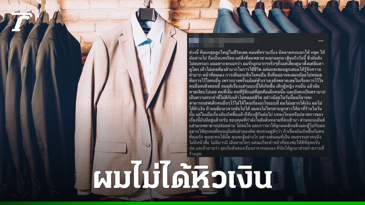 พ่อสาว 19 เจ้าของร้านสูท ที่กำลังมีประเด็นกับ “ทนายแก้ว” โพสต์เหตุผลต้องลุกขึ้นสู้ แม้มีคนบอกให้หยุด ภาวนาให้ลูกเข้มแข็ง บอกถ้าย้อนเวลากลับไปได้ จะไม่โทรตามลูกมาที่ร้าน
