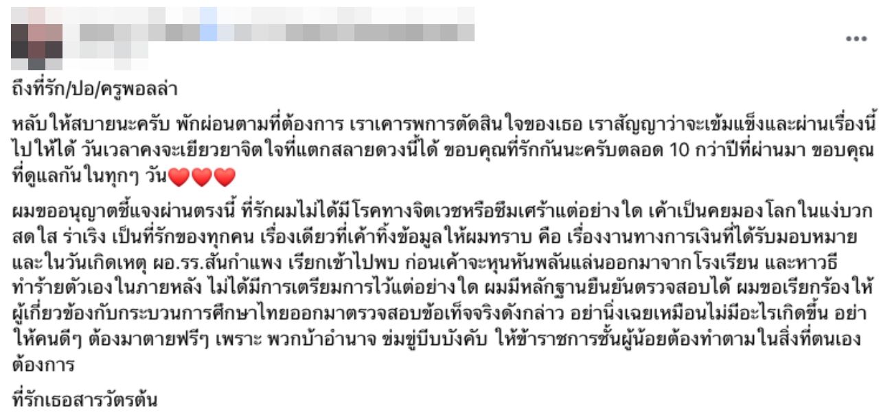 ผมขออนุญาตชี้แจงผ่านตรงนี้ ที่รักผมไม่ได้มีโรคทางจิตเวชหรือซึมเศร้าแต่อย่างใด เขาเป็นคนมองโลกในแง่บวก สดใส ร่าเริง เป็นที่รักของทุกคน เรื่องเดียวที่เขาทิ้งข้อมูลให้ผมทราบ คือ เรื่องงานทางการเงินที่ได้รับมอบหมาย และในวันเกิดเหตุ ผอ.โรงเรียน เรียกเข้าไปพบ ก่อนเขาจะหุนหันพลันแล่นออกมาจากโรงเรียน และหาวิธีทำร้ายตัวเองในภายหลัง ไม่ได้มีการเตรียมการไว้แต่อย่างใด
