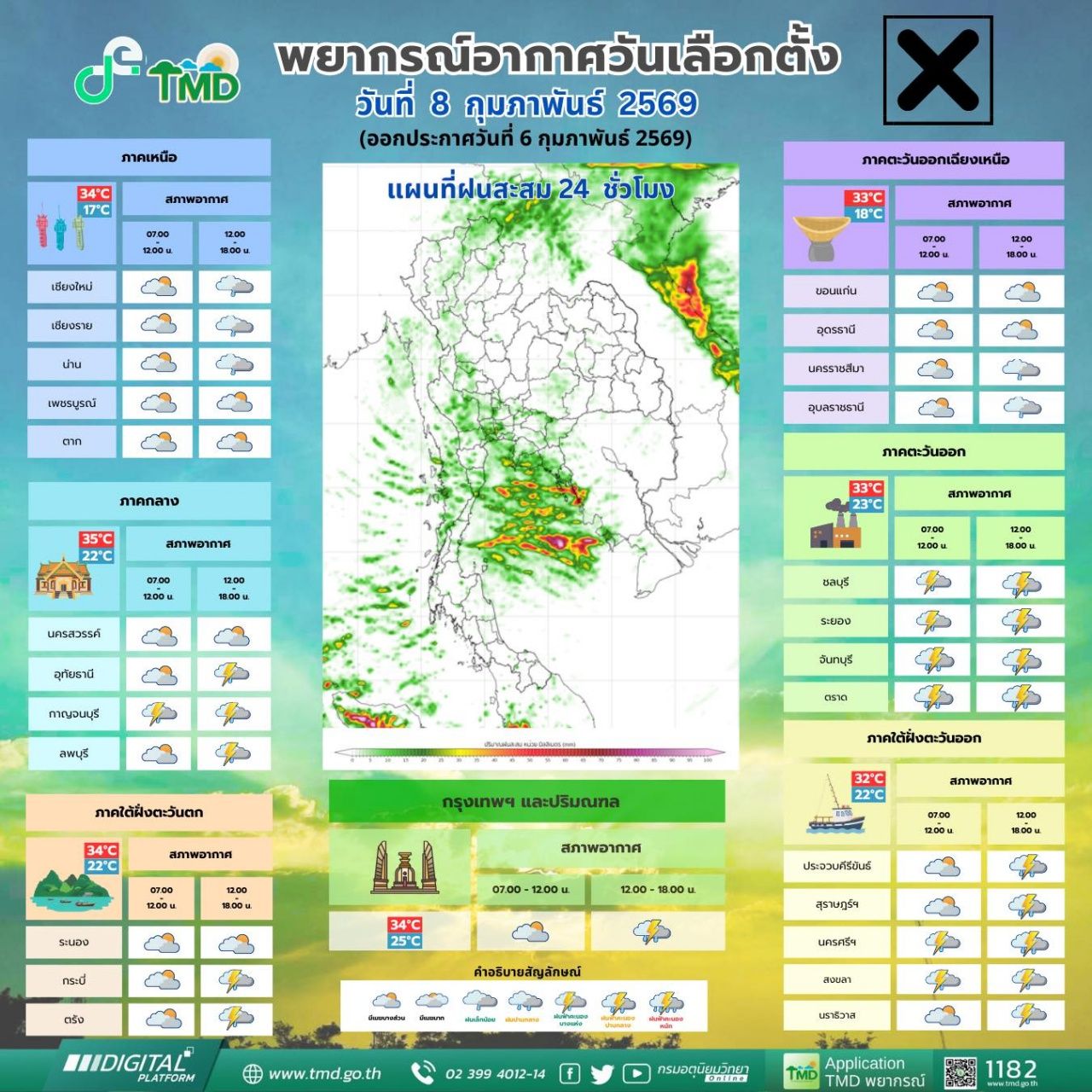 ส่วนวันที่ 8 ก.พ. 69 วันเลือกตั้ง ฝนจะก่อตัวในช่วงเที่ยง หรือช่วงบ่าย และมีความเสี่ยงไปจนถึงช่วงเย็น โดยฝนมีการเคลื่อนตัวอยู่ตลอด ไม่ใช่การตกแช่ คาดว่าส่วนใหญ่จะเป็นฝนเล็กน้อยถึงปานกลาง ขอให้ประชาชนเตรียมตัวพกร่ม และอุปกรณ์ป้องกันฝนในวันเลือกตั้ง โดยช่วงเวลาแนะนำที่ดีที่สุดคือ ช่วงเช้า-เที่ยง ซึ่งฝนอาจมีโอกาสตกน้อยกว่า