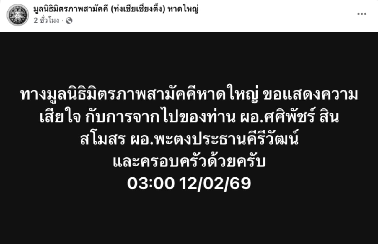 ล่าสุดสุดวันที่ 12 ก.พ. 69 เวลาทางเพจ มูลนิธิมิตรภาพสามัคคี (ท่งเซียเซี่ยงตึ๊ง) หาดใหญ่ ได้โพสต์ข้อความระบุว่า ทางมูลนิธิมิตรภาพสามัคคีหาดใหญ่ ขอแสดงความเสียใจ กับการจากไปของท่าน ผอ.ศศิพัชร สินสโมสร ผอ.พะตงประธานคีรีวัฒน์ และครอบครัวด้วยครับ 03:00 12/02/69
