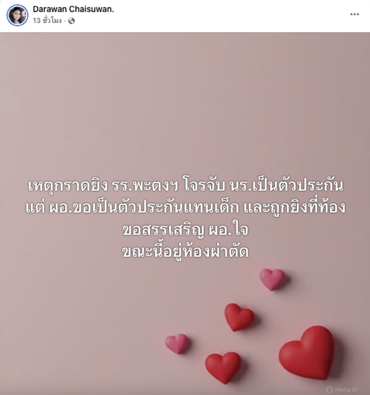 ทางโลกออนไลน์ ก็ได้มีการโพสต์แจ้งข่าวเศร้า และแสดงความเสียใจกับการจากไปครั้งนี้เป็นจำนวนมาก หลังจากทราบข้อมูลจากครูในโรงเรียน ที่ออกมาเปิดเผยผ่านทางเฟซบุ๊ก "Darawan Chaisuwan" ระบุว่าเหตุการณ์คนร้ายบุกโรงเรียน จับนักเรียนเป็นตัวประกัน ผอ. ได้ขอเป็นตัวประกันแทนเด็ก และถูกยิงบาดเจ็บ จึงสร้างความสะเทือนใจให้กับคนที่ทราบข่าวเป็นจำนวนมาก