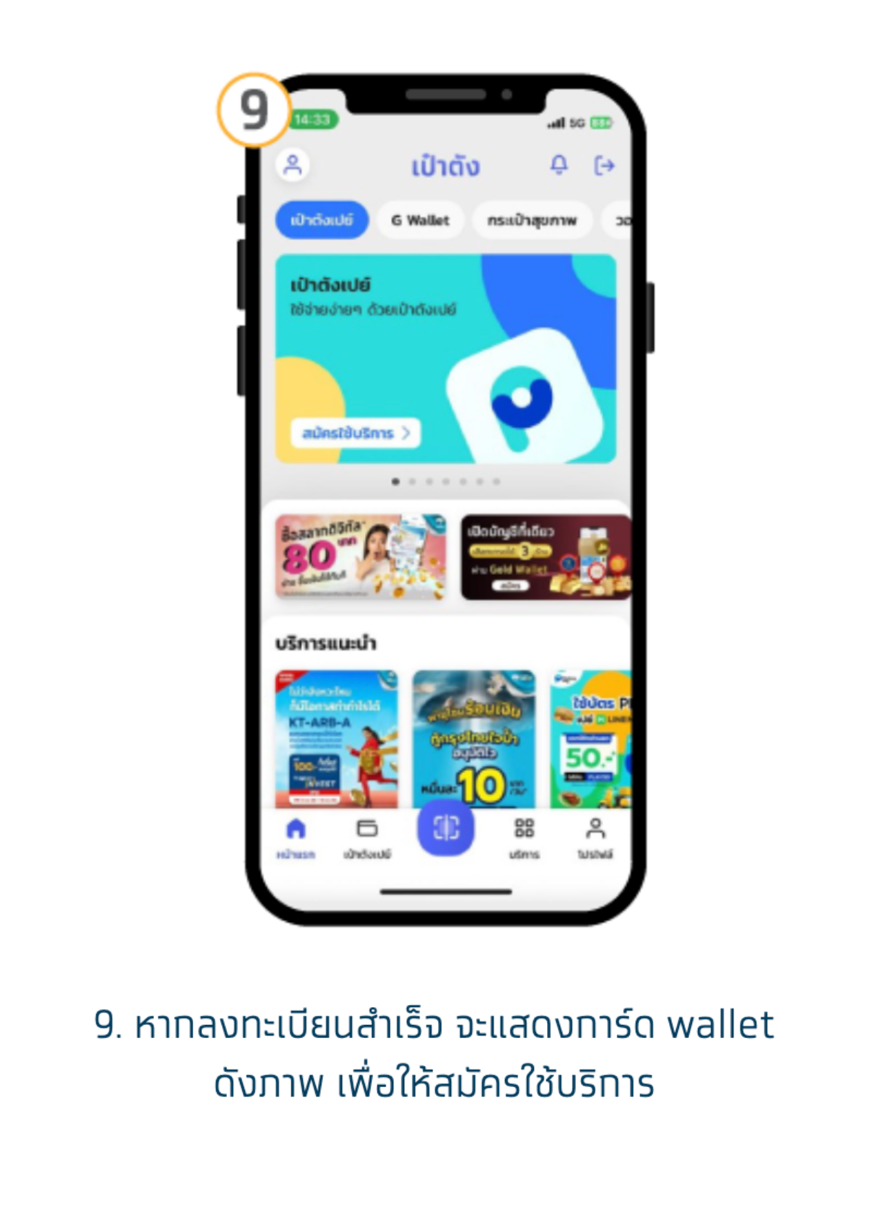 9. หากลงทะเบียนสำเร็จ จะแสดงการ์ด wallet ดังภาพ เพื่อให้สมัครใช้บริการ.