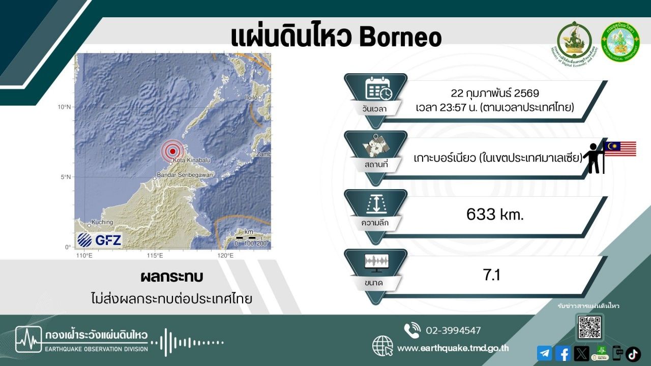 มีรายงานว่า กรมอุตุนิยมวิทยา ประกาศ เรื่อง แผ่นดินไหวที่ Borneo ฉบับที่ 1 โดยระบุว่า เมื่อวันที่ 22 กุมภาพันธ์ พ.ศ. 2569 เวลา 23.57 น. เกิดแผ่นดินไหว จุดศูนย์กลางอยู่ บริเวณ Borneo ที่ละติจูด 6.870 องศาเหนือ ลองจิจูด 116.260 องศาตะวันออก ขนาด 7.1 ความลึก 633 กิโลเมตร ไม่ส่งผลกระทบต่อประเทศไทย หากมีรายละเอียดเพิ่มเติมจะแจ้งให้ทราบโดยด่วนต่อไป