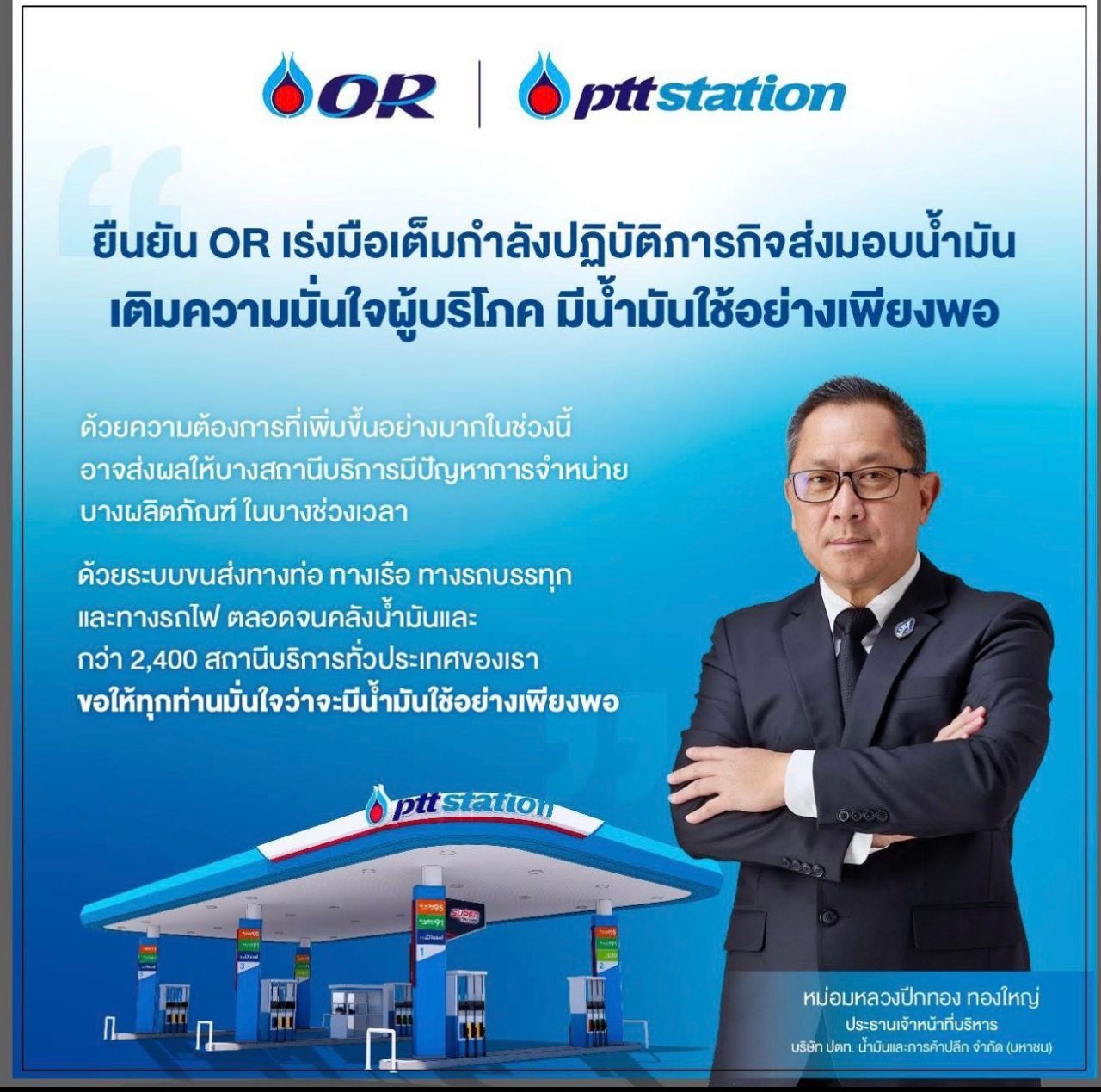 ม.ล.ปีกทอง ทองใหญ่ CEO OR “ปตท.” ยืนยันน้ำมันไม่ขาดแน่นอน แต่ความต้องการมากขึ้น ทำให้บางช่วงเวลา บางปั๊มเกิดปัญหาขนส่งไม่ทัน