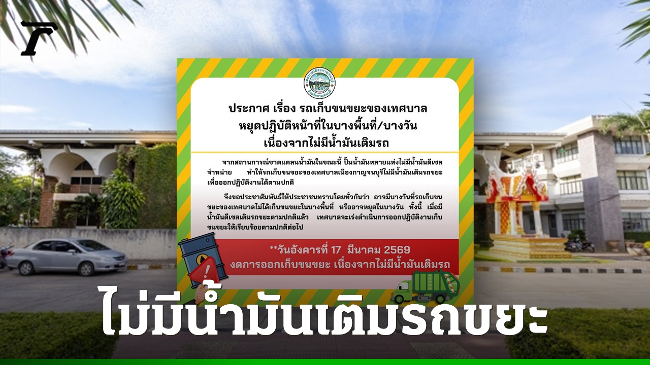 มีรายงานว่า เมื่อวันที่ 16 มี.ค. 69 เพจเฟซบุ๊ก สำนักงานเทศบาลเมืองกาญจนบุรี ประกาศ เรื่อง รถเก็บขนขยะของเทศบาลหยุดปฏิบัติหน้าที่ในบางพื้นที่/บางวัน เนื่องจากไม่มีน้ำมันเติมรถ โดยระบุว่า จากสถานการณ์ขาดแคลนน้ำมันในขณะนี้ ปั๊มน้ำมันหลายแห่งไม่มีน้ำมันดีเซลจำหน่าย ทำให้รถเก็บขนขยะของเทศบาลเมืองกาญจนบุรีไม่มีน้ำมันเติมรถขยะ เพื่อออกปฏิบัติงานได้ตามปกติ