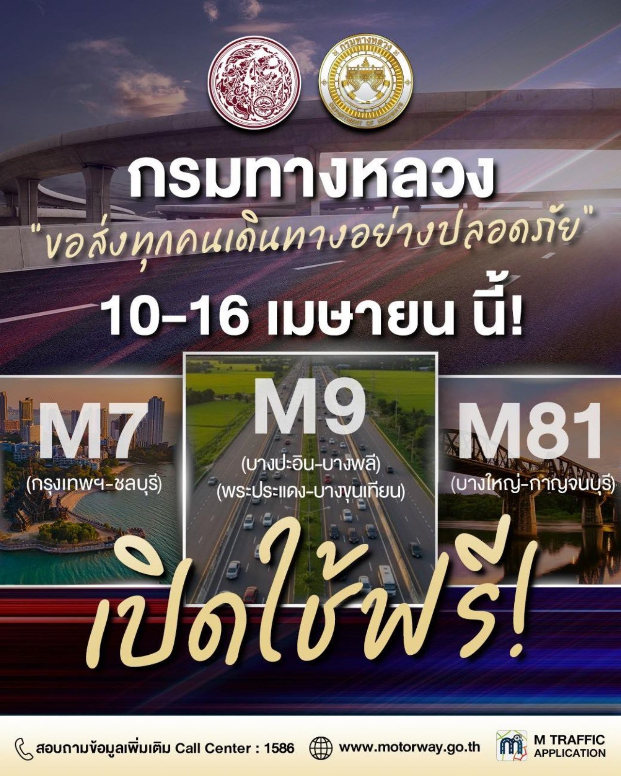รวมไว้แล้ว มอเตอร์เวย์ฟรี 7 วันเต็ม ช่วงเทศกาลสงกรานต์ เริ่ม 10-16 เม.ย. 69 พร้อมพิกัดจุดพักรถมอเตอร์เวย์ แนะประชาชนวางแผนล่วงหน้าก่อนเดินทาง