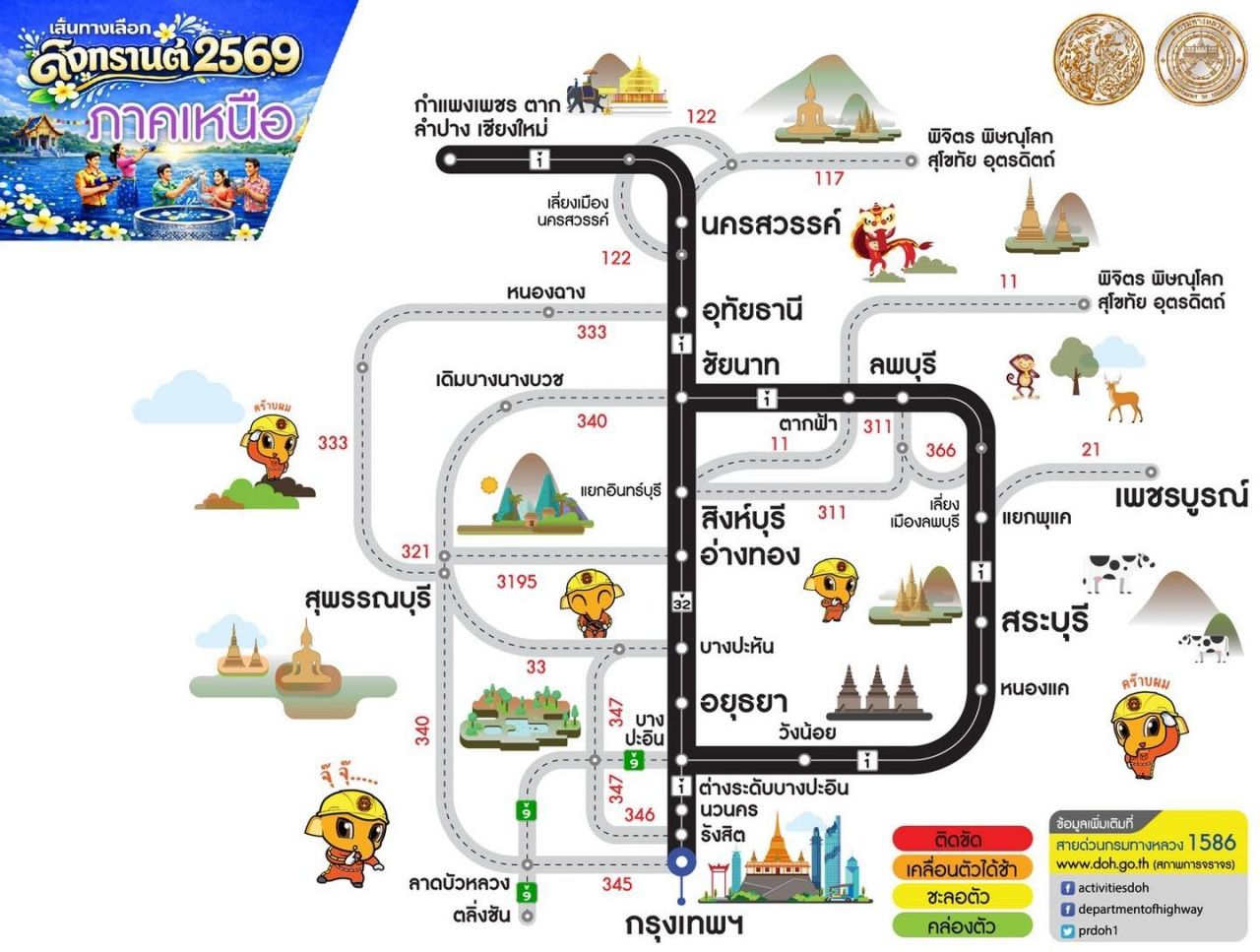 อย่างไรก็ตาม หากประชาชนต้องการสอบถามข้อมูลการเดินทางเพิ่มเติม หรือ แจ้งเหตุด่วนเหตุร้ายระหว่างเดินทาง สามารถติดต่อได้ที่ สายด่วนกรมทางหลวง 1586 (โทรฟรีทุกเครือข่ายตลอด 24 ชั่วโมง) สายด่วนมอเตอร์เวย์ 1586 กด 7 และตำรวจทางหลวง 1193