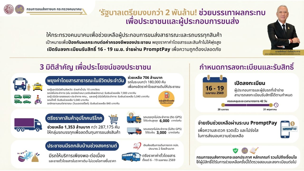 ลงทะเบียนมาตรการเยียวยา "ผู้ประกอบการขนส่ง" และ "รถโดยสารสาธารณะ" เริ่ม 16-19 เม.ย. 69 รับเงินช่วยเหลือผ่านพร้อมเพย์