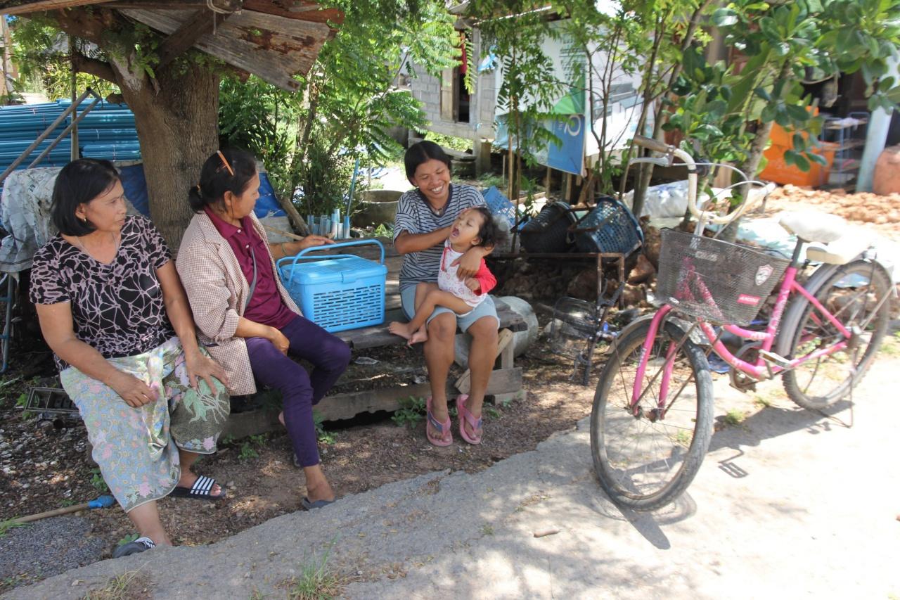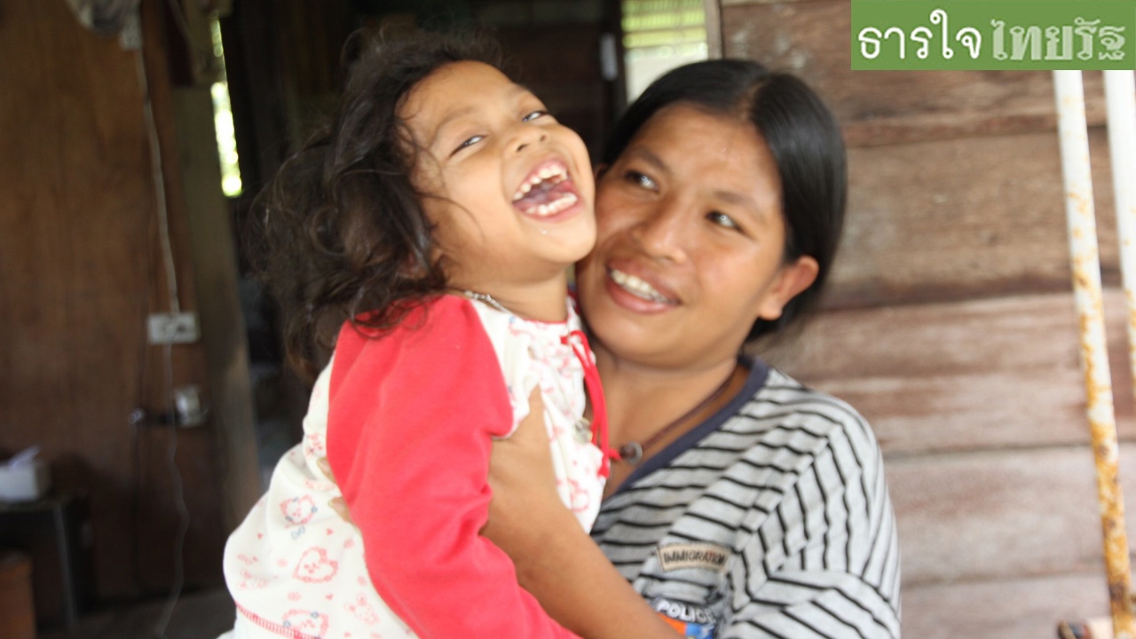 นางเจร สุขเขียว อายุ 36 ปี มารดา กล่าวว่า น้องบิว เป็นบุตรคนที่ 2 ในพี่น้อง 2 คน ซึ่งเป็นโรคต่างๆ ตั้งแต่เกิด ขณะนี้ต้องทำกายภาพบำบัดสัปดาห์ละ 2 วัน และแพทย์ประจำโรงพยาบาลประจำจังหวัดนัด 3 เดือนครั้ง และ 4 เดือนครั้ง รักษาสมองและพัฒนาการ ซึ่งค่ารักษาพยาบาลไม่ต้องชำระ แต่มีค่าใช้จ่ายในการเดินทางประมาณครั้งละ 200 บาท ซึ่งรายได้มาจากสามีที่เป็นลูกจ้างประมง ได้ค่าจ้างวันละ 200-300 บาท ส่วนตนเองต้องดูแลบุตรสาวอย่างใกล้ชิด แต่เนื่องจากค่าใช้จ่ายไม่พอจึงได้ทำขนมโตเกียวขายกล่องละ 10 บาท วันละ 30 กล่อง ยืมจักรยานเพื่อนบ้านปั่นไปขายตามร้านอาหาร ได้กำไรวันละ 100 บาท เวลาออกไปขายขนมจะฝากบุตรสาวไว้กับญาติสามี หรือพ่อแม่สามีที่อยู่ในวัยชรา