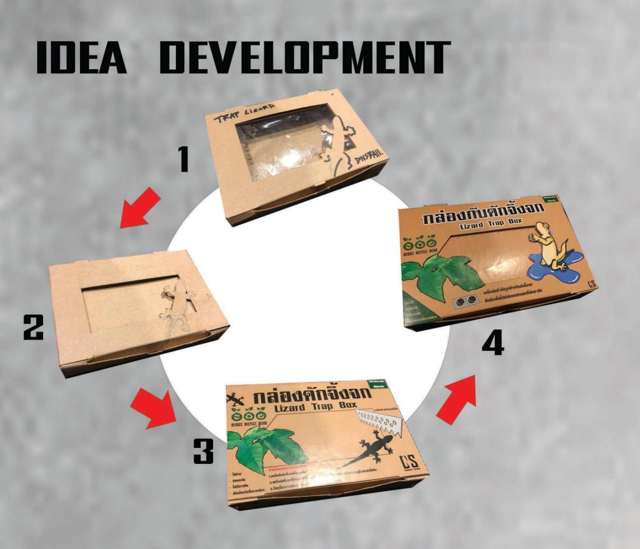น้องบอล เจ้าของผลงาน กล่าวต่อว่า จากเหตุการณ์ที่กล่าวมาข้างต้นตนเองจึงอยากออกแบบและพัฒนาผลิตภัณฑ์กล่องดักจิ้งจกขึ้นมา โดยมีแนวคิดจิ้งจกที่ดักต้องไม่ตายและต้องสร้างความแปลกใหม่ให้กับที่พักอาศัย มีรูปทรงที่สวยงามและสอดคล้องกับจิ้งจก เหมาะกับการติดภายในอาคารเพื่อทำให้ประหยัดเนื้อที่ในการใช้งาน มีความแข็งแรง สะดวกสบาย รูปร่าง รูปทรง และที่สำคัญสามารถใช้งานได้อย่างมีประสิทธิภาพ อำนวยความสะดวกต่อผู้พักอาศัย และตอบสนองความต้องการของผู้ใช้สอยเป็นได้อย่างดี
