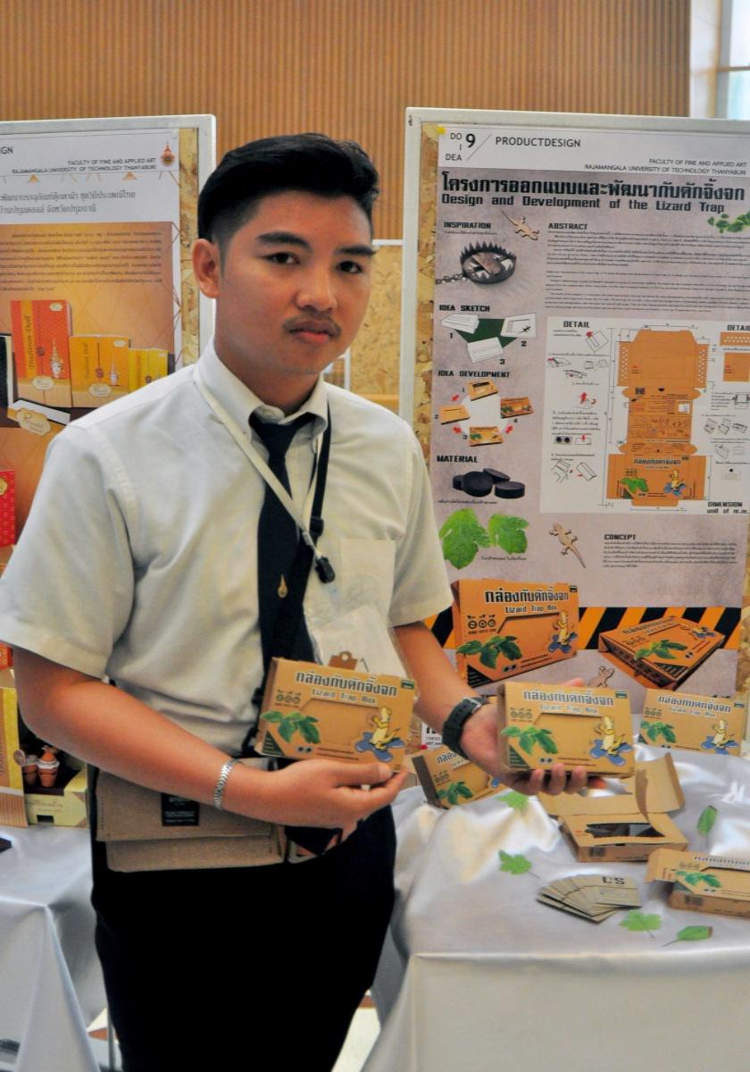 นายดนุสรณ์ พุ่มทับทิม หรือ น้องบอล นักศึกษาชั้นปีที่ 4 สาขาวิชาออกแบบผลิตภัณฑ์ มหาวิทยาลัยเทคโนโลยีราชมงคล (มทร.) ธัญบุรี เจ้าของไอเดีย กล่าวถึงที่มาของกล่องดักจิ้งจกว่า หลายๆ บ้านคงมีปัญหาไม่ต่างกัน สัตว์เลี้ยงที่มาอาศัยในบ้านโดยไม่ได้รับเชิญโดยเฉพาะ จิ้งจก ซึ่งจิ่งจกมีทั้งข้อดีและข้อเสีย ข้อดีช่วยกินแมลงภายรอบบ้านบริเวณแสงไฟเวลากลางคืน ข้อเสียจิ้งจกมักปล่อยมูลหล่นเปื้อนติดพื้น ติดเสื้อผ้า เป็นสาเหตุก่อให้เกิดเชื้อแบคทีเรีย Salmonella โดยทุกบ้านจึงมีวิธีในการกำจัดที่แตกต่างกัน กับดักจิ้งจกเป็นอีกหนึ่งตัวเลือก มีหลากหลายรูปแบบ รูปแบบกล่องพลาสติกฉีดขึ้นรูปสี่เหลี่ยมและภายในมีแผ่นกาวสำหรับดักจับจิ้งจกและมีกลิ่นหรือสารล่ออยู่ภายในแผ่นกาวเพื่อให้จิ้งจกมาติดโดยไม่สามารถขยับไปไหนได้ กับดักจิ้งจกที่เป็นแผ่นกาว เป็นการทรมานสัตว์ หรือ อาจจะทำให้สัตว์ตายได้