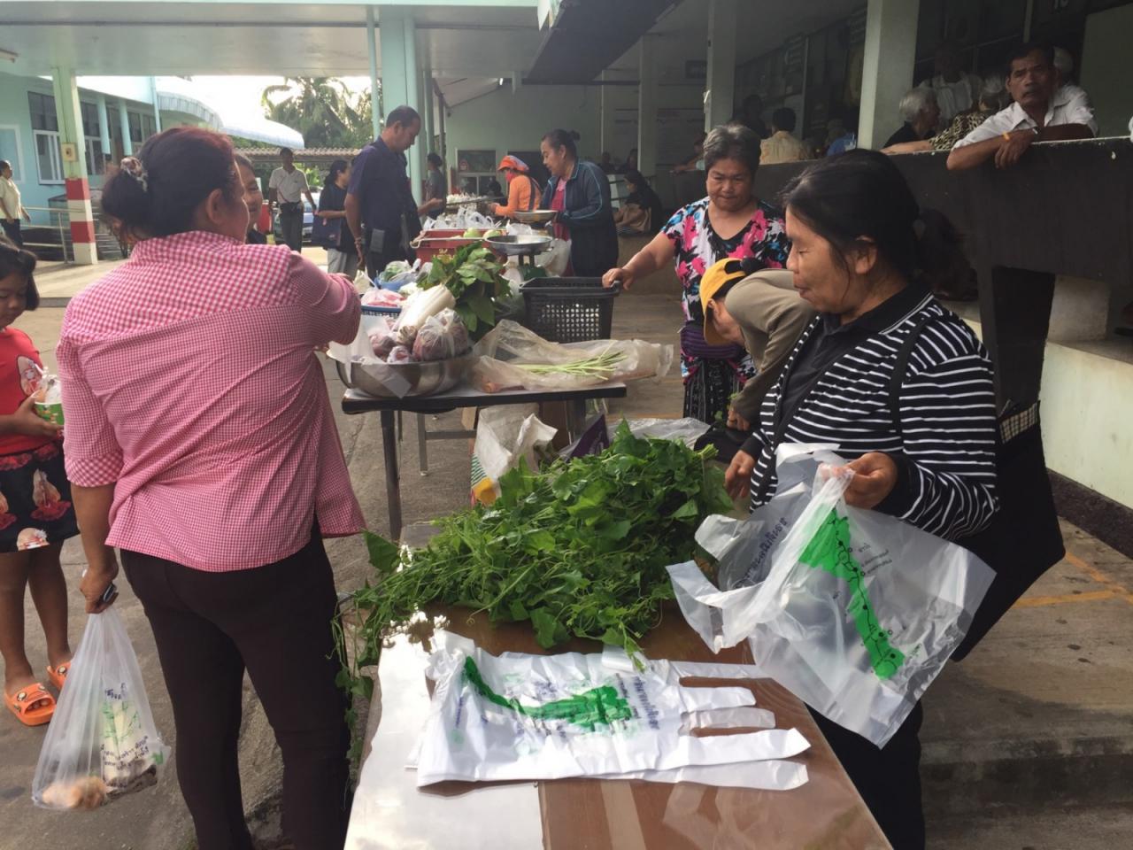 เมื่อวันที่ 21 มิ.ย.2560 ผู้สื่อข่าวรายงาน ที่ลานหน้าตึก 2 รพ.บางสะพานน้อย จ.ประจวบคีรีขันธ์ มีชาวบ้าน นำผักบ้าน ผักป่า เช่น หัวปลีกล้วย ลูกระกำเปรี้ยว แตงกวา พริก เป็นต้น และอาหารแปรรูป น้ำพริก โดยมีเจ้าหน้าที่โรงพยาบาล ญาติผู้ป่วย และชาวบ้าน ให้ความสนใจเลือกซื้อเป็นจำนวนมาก