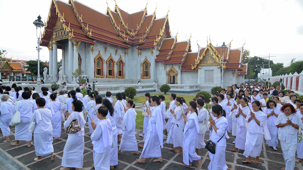 พุทธศาสนิกชนจำนวนมาก นำดอกไม้ธูปเทียนมาร่วมกิจกรรมเวียนเทียนเนื่องในวันอาสาฬหบูชา บริเวณรอบพระอุโบสถวัดเบญจมบพิตรดุสิตวนารามราชวรวิหาร กรุงเทพฯ ขณะที่ทุกจังหวัดทั่วประเทศได้จัดกิจกรรมสำคัญทางศาสนาดังกล่าวตามแบบอย่างวิถีชาวพุทธที่ดีเช่นกัน.