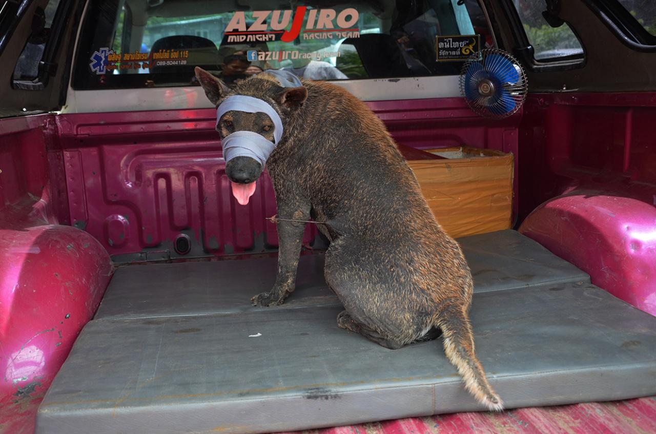 ผู้สื่อข่าวได้รับแจ้งจาก นางคณิต ขุนจ่าเมือง อายุ 53 ปี ชาวหนองบัวลำภู ว่า เมื่อคืนที่ผ่านมา ขณะที่อยู่บ้านกับลูกสาวได้ยินสุนัขส่งเสียงร้องอยู่หน้าบ้าน ออกไปดูพบว่าเป็นสุนัขชื่อ เจ้าหมอก อายุประมาณ 4-5 ปี เป็นสุนัขจรจัดพันธุ์ไทยอาศัยอยู่ที่วัดพิศาล มีฉมวกแทงอยู่บริเวณกลางลำตัว มีเลือดไหล และเจ้าหมอกมีอาการเหนื่อยล้า เดินไม่ได้ นางคณิต และลูกสาวจึงช่วยกันนำเจ้าหมอก ไปหาสัตวแพทย์ที่คลินิก โดยสัตวแพทย์ดูอาการแล้วเห็นว่าอุปกรณ์ไม่พร้อมให้นำส่งโรงพยาบาลสัตว์ที่ จ.อุดรธานี โดยทางคลินิกได้รักษาฉีดยาให้เบื้องต้น ต่อมา น.ส.กัญชยารัตน์ ขุนจ่าเมือง ลูกสาวนางคณิต ได้ถ่ายภาพเจ้าหมอก พร้อมกับโพสต์ขอความช่วยเหลือทางเฟซบุ๊กกู้ภัยหมาแมว ก่อนที่ทางกู้ภัยจะประสานยังมูลนิธิ The Voice (เสียงจากเรา) ให้นำเจ้าหมอก ส่งโรงพยาบาลสัตว์ที่ทางเข้าสนามบินอุดรธานี กระทั่งวันนี้ (9 ก.ค. 60) เวลา 11.30 น. กู้ภัยนเรศวรหนองบัวลำภู มารับเจ้าหมอกไปโรงพยาบาลสัตว์