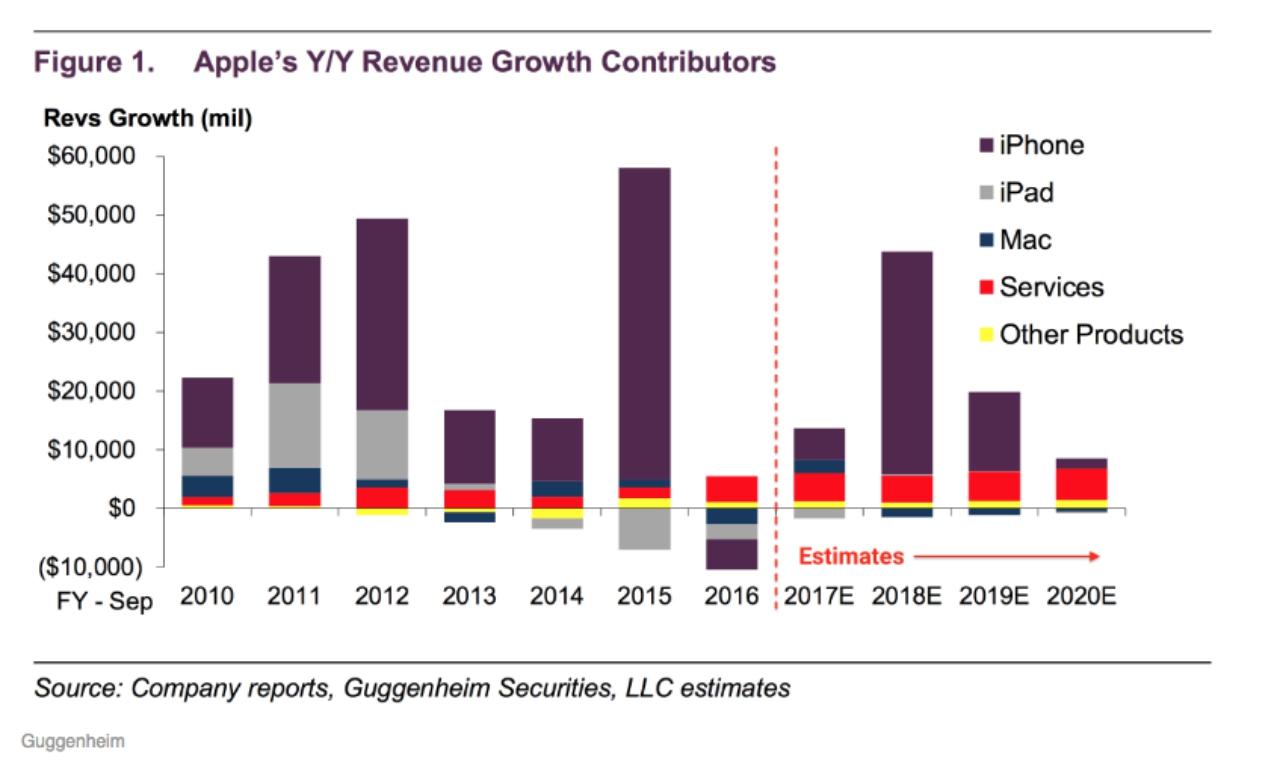 Robert Cihra นักวิเคราะห์จากสถาบัน Guggenheim Securities แสดงกราฟการเติบโตของรายได้จากแอปเปิล แบ่งออกตามผลิตภัณฑ์ จะเห็นได้ว่า 10 ปีที่ผ่านมาทุกผลิตภัณ์ของแอปเปิลโดยเฉพาะไอโฟนนั้นมีการเติบโตอย่างต่อ เนื่องมาตลอด จนกระทั่งปี 2016 ที่ยอดขาย ไอโฟน 7 ลดลงเป็นครั้งแรกอย่างชัดเจน รวมถึงผลิตภัณฑ์อื่นๆ ทั้งไอแพดและแมคบุ๊กก็ลดลงอย่างน่าตกใจ (ยอดการเติบโตของไอแพดตกลงมาตั้งแต่ปี 2014)