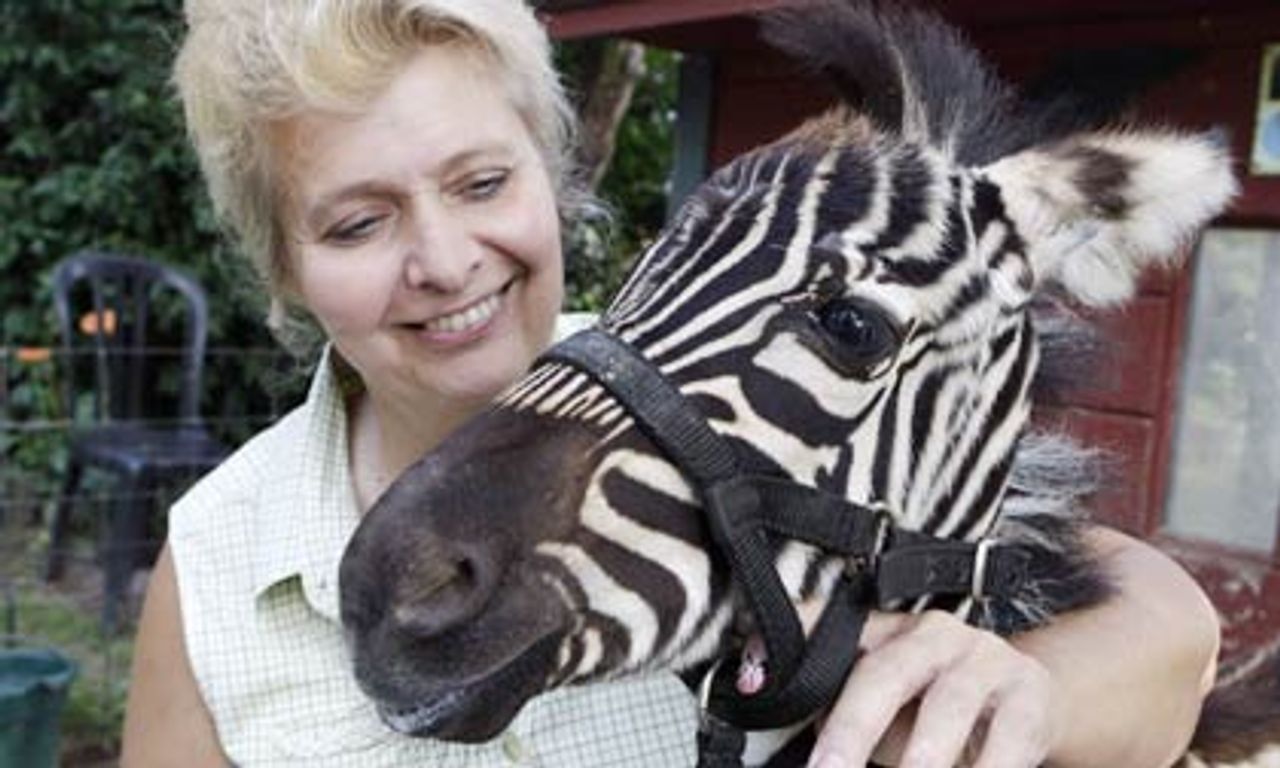 ซินดี ฮันท์สแมน โอบลูกม้าลายซาวันนาฮ์ ที่ภายในฟาร์มสตัมป์ฮิลล์ของเธอเอง ที่เมืองมาสซิลลอน รัฐโอไฮโอ สหรัฐอเมริกา ฮันท์สแมนร่วมกับกลุ่มสมาคมฮิวเมน โซไซตี้ กำลังยื่นข้อเสนอว่าควรจะประกาศห้ามการเลี้ยงสัตว์ เลี้ยงแปลกๆจากต่างประเทศ.