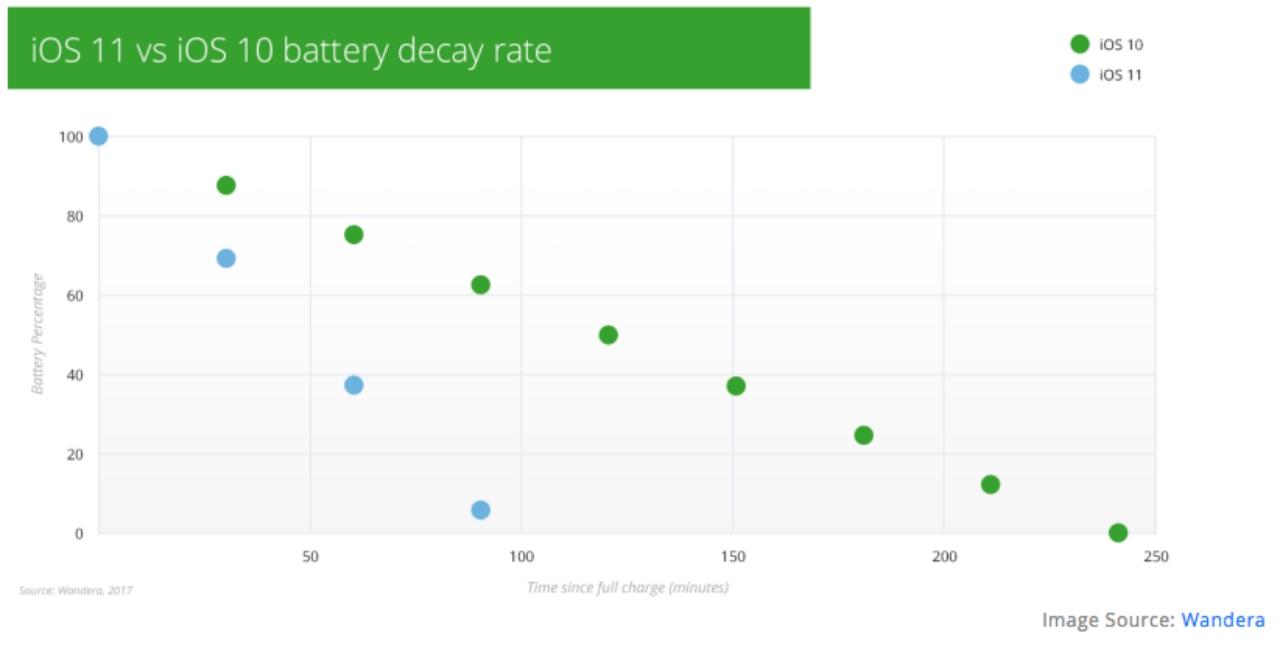 ล่าสุดนี้ บริษัท Wandera บริษัทที่ดูแลด้านความปลอดภัยและบริการด้านฐานข้อมูลของสมาร์ทโฟน ได้ชี้แจงถึงผลสำรวจว่า พบว่า iOS 11 ใช้งานแบตเตอรี่เพิ่มขึ้นมากกว่าระบบปฏิบัติการรุ่นเก่าสูงถึง 60% (ส่งผลให้แบตหมดไวมาก)