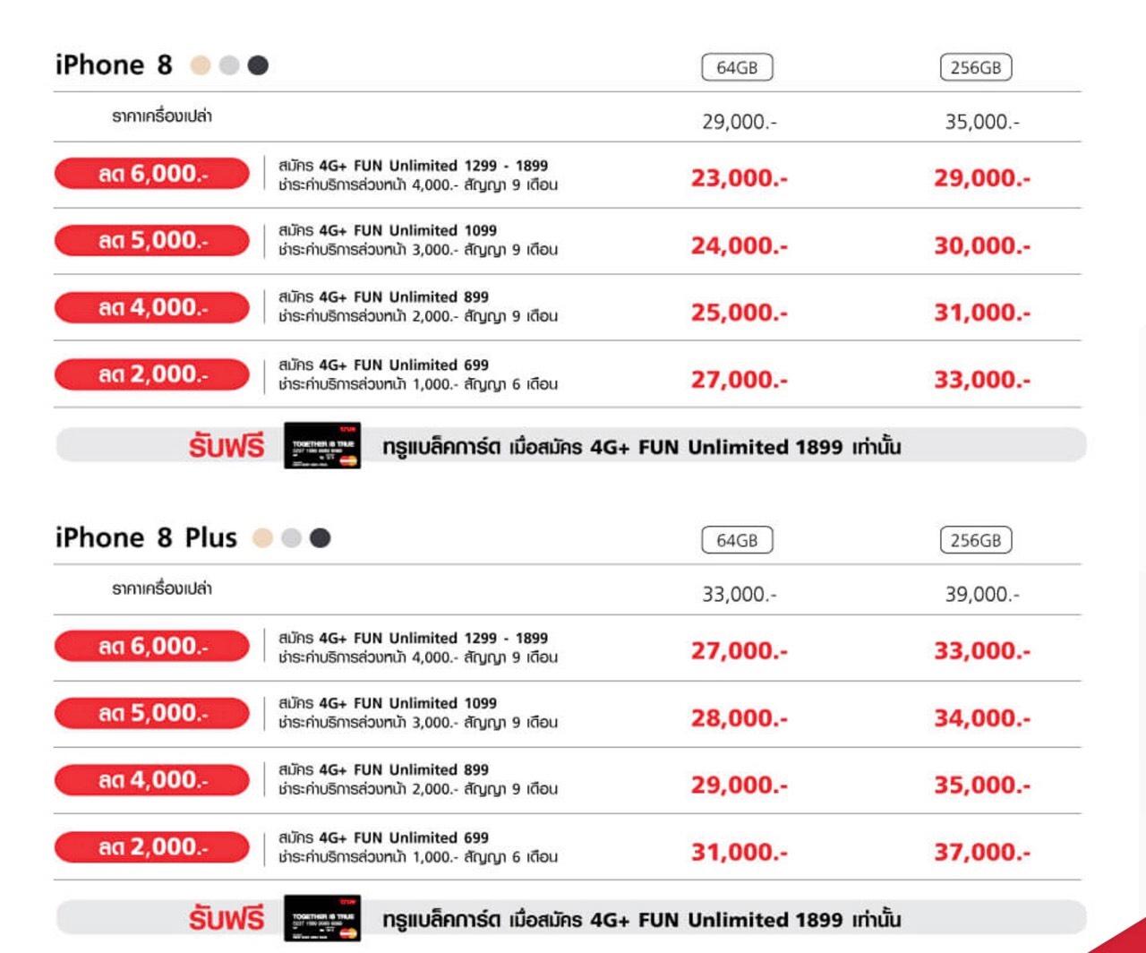 1. TrueMoveH: รอบนี้ทรูมูฟเอชทำราคาเครื่องได้ดีเมื่อขายเครื่องร่วมกับแพ็กเกจรายเดือน โดยไอโฟน 8 มีราคาเริ่มต้นที่ 23,000 บาท (สัญญา 9 เดือน)