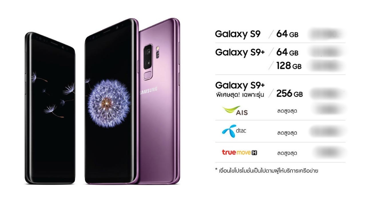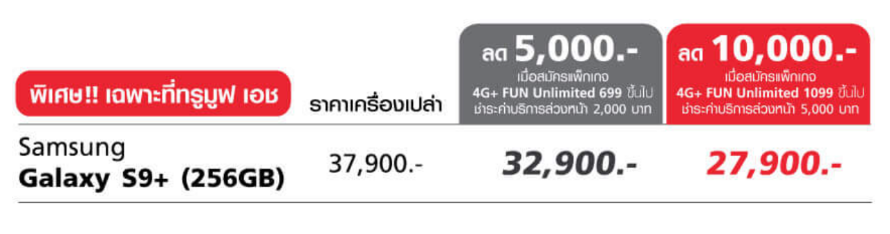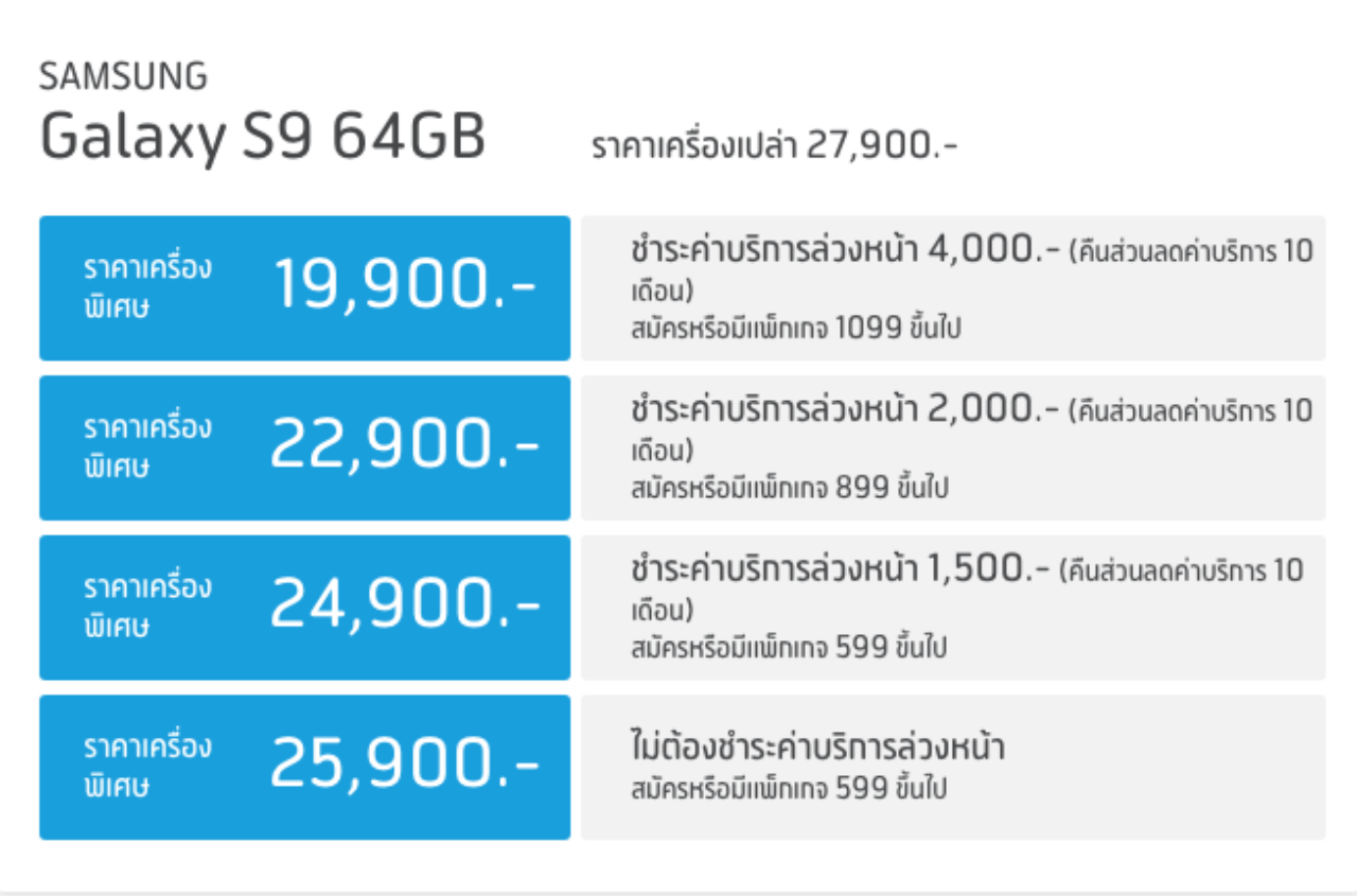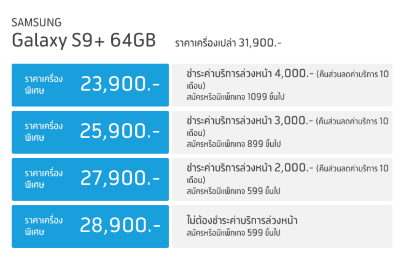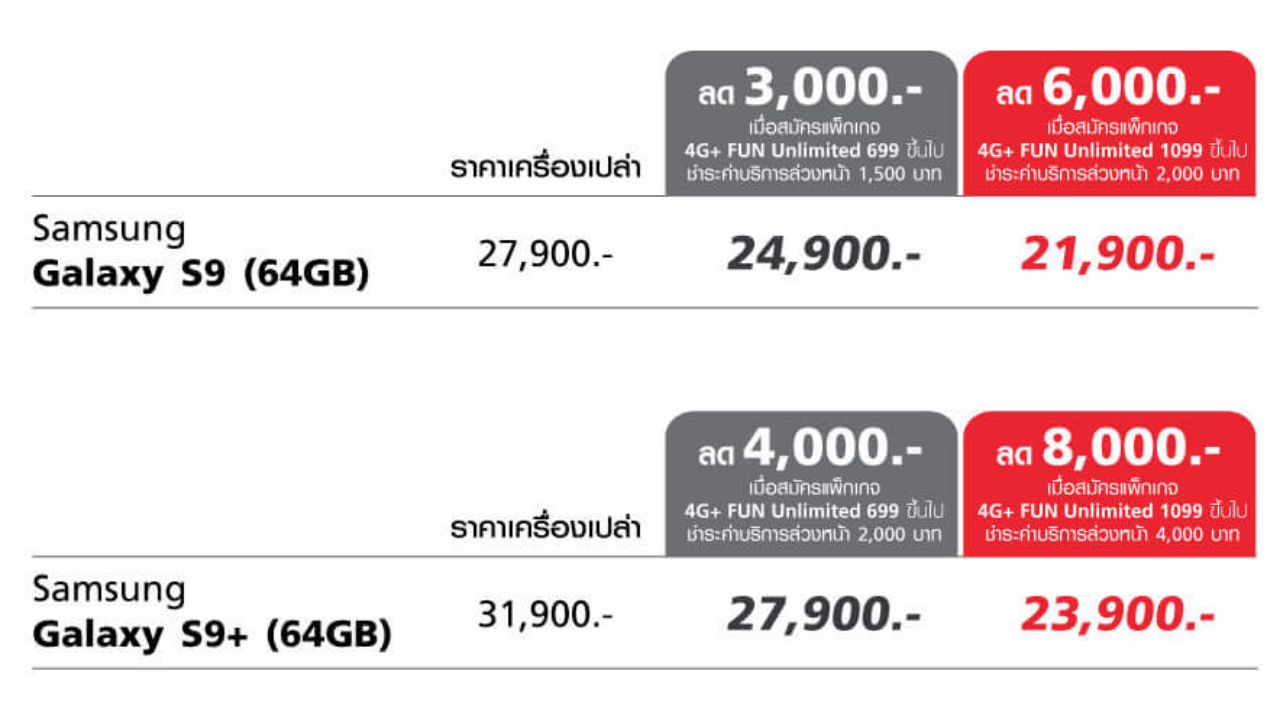 Galaxy S9 64GB ราคาพิเศษเริ่มต้นที่ 19,900 บาทเท่านั้น(สมัครพร้อมแพ็กเกจ) ทั้งนี้ยังมีส่วนลดค่าเครื่องทันที สูงสุดถึง 11,500 บาท เมื่อสมัครแพ็กเกจรายเดือนตั้งแต่ 1,099 บาทขึ้นไป รับส่วนลดค่าเครื่องทันที 10,000 บาท และสำหรับลูกค้าย้ายค่ายเบอร์เดิม รับส่วนลดเพิ่มอีก 1,500 บาท กับแพ็กเกจ Go No Limit