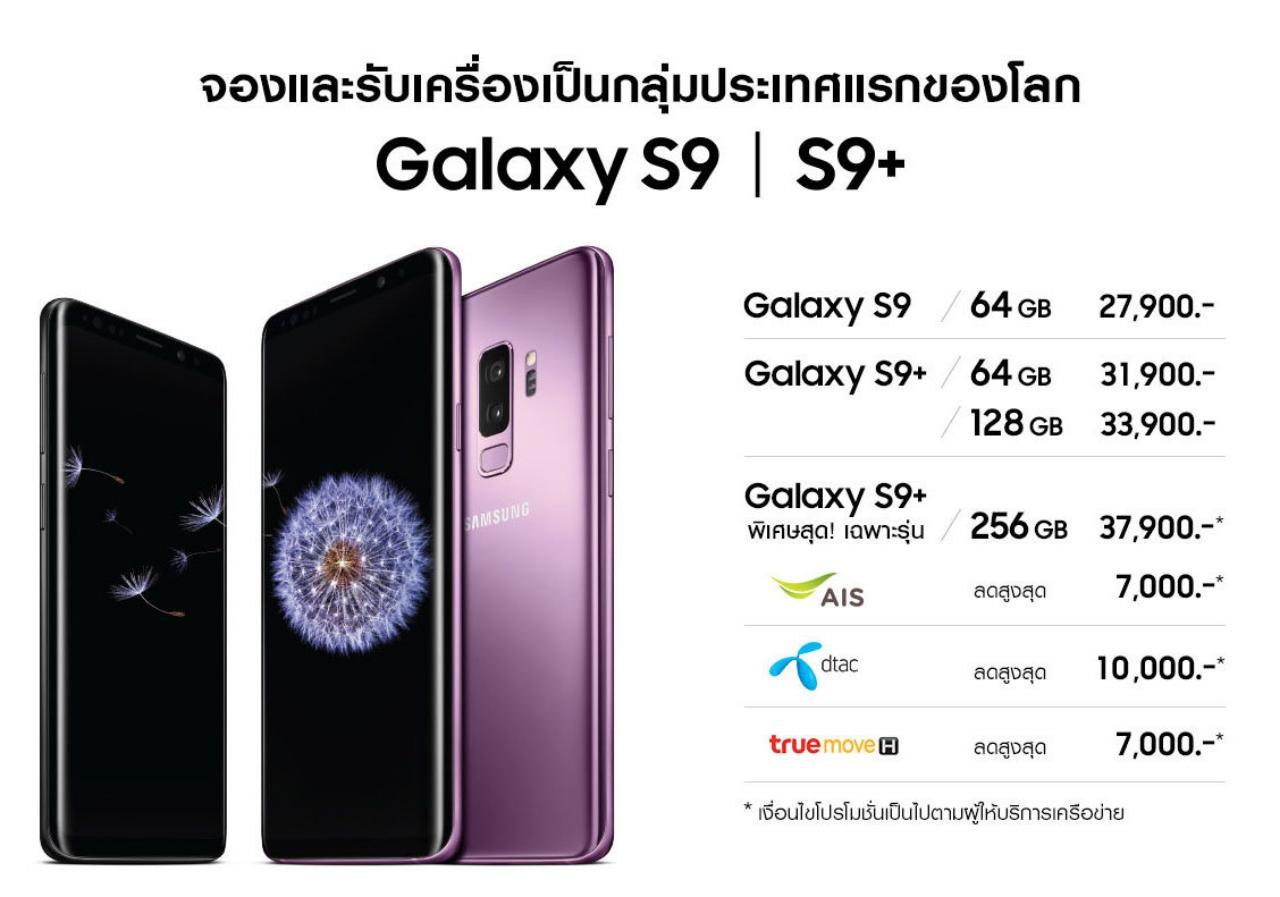 สำหรับเครื่องเปล่า Galaxy S9 64GB จะมีราคาเริ่มต้นที่ 27,900 บาท ส่วน Galaxy S9+ ขนาด 64GB ราคาอยู่ที่ 31,900 บาท ส่วน 128GB ราคาอยู่ที่ 33,900 บาท