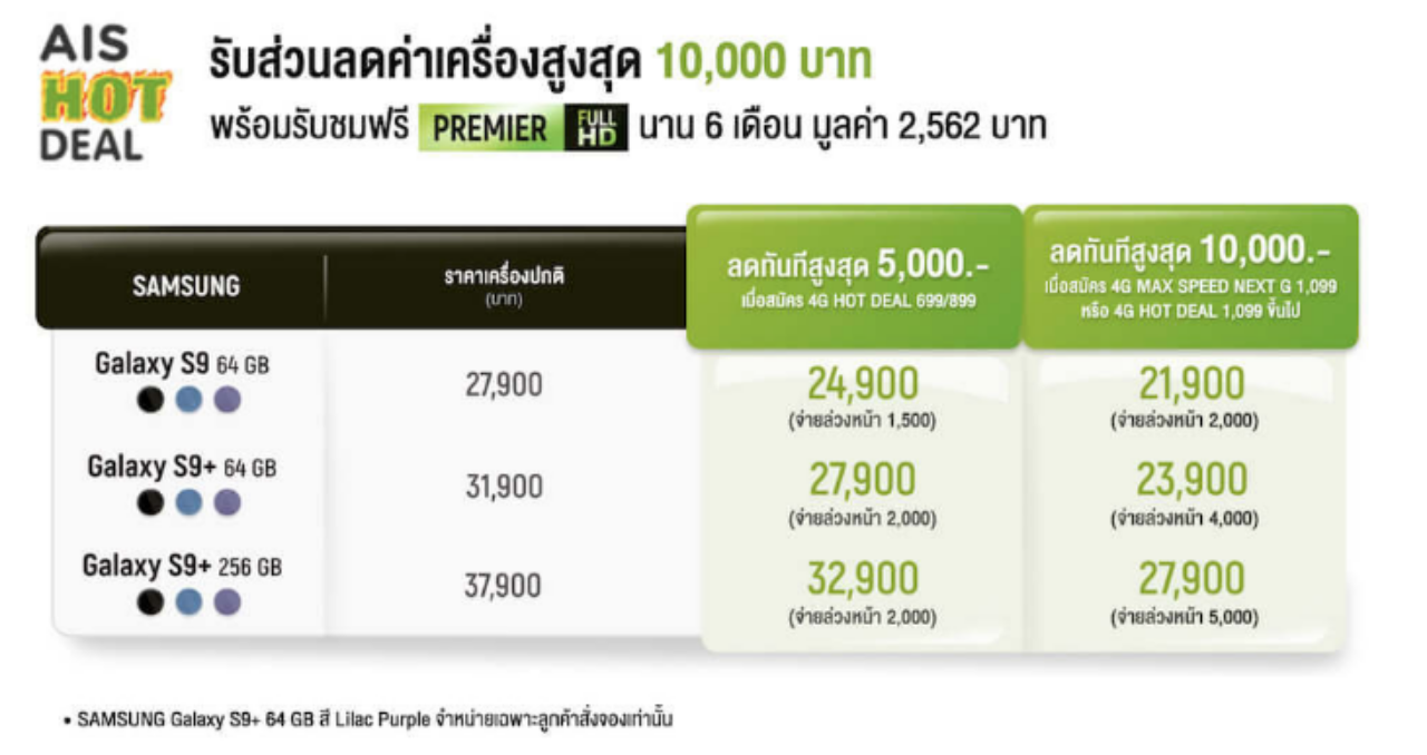 รับส่วนลดค่าเครื่องสูงสุด 7,000 บาท เมื่อสมัครแพ็กเกจ 4G Max Speed Next G 1,099 บาท หรือแพ็กเกจ 4G Hot Deal 1,099 บาท ขึ้นไป และชำระค่าบริการล่วงหน้าเพียง 1,000 บาท นอกจากนั้นยังรับส่วนลดค่าเครื่องเพิ่มอีก 1,000 บาท เป็น 8,000 บาท บาท สำหรับลูกค้าย้ายค่ายเบอร์เดิม สำหรับลูกค้าเอไอเอส เซเรเนด อัพเกรดเครื่อง SAMSUNG Galaxy S8|S8+ เป็น SAMSUNG Galaxy S9|S9+ ได้ในราคาเริ่มต้นเพียง 10,900 บาท