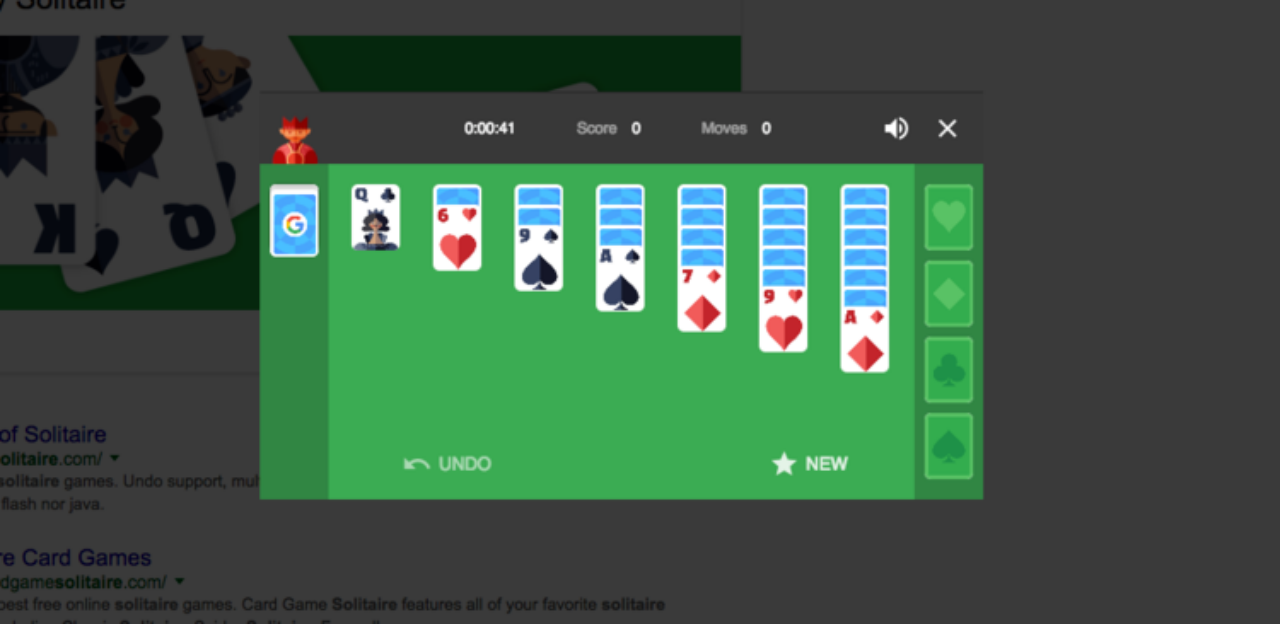 เกมไพ่ชื่อดังอย่าง "โซลิแท" ที่ฮิตกันทั่วโลกก็ถูกนำมาฝังไว้ใน Google Search Bar เพียงคุณค้นหาคำว่า Solitaire คุณก็สามารถเล่นเกมนี้ได้ทันทีโดยไม่ต้องโหลดแอปพลิเคชันใดๆ