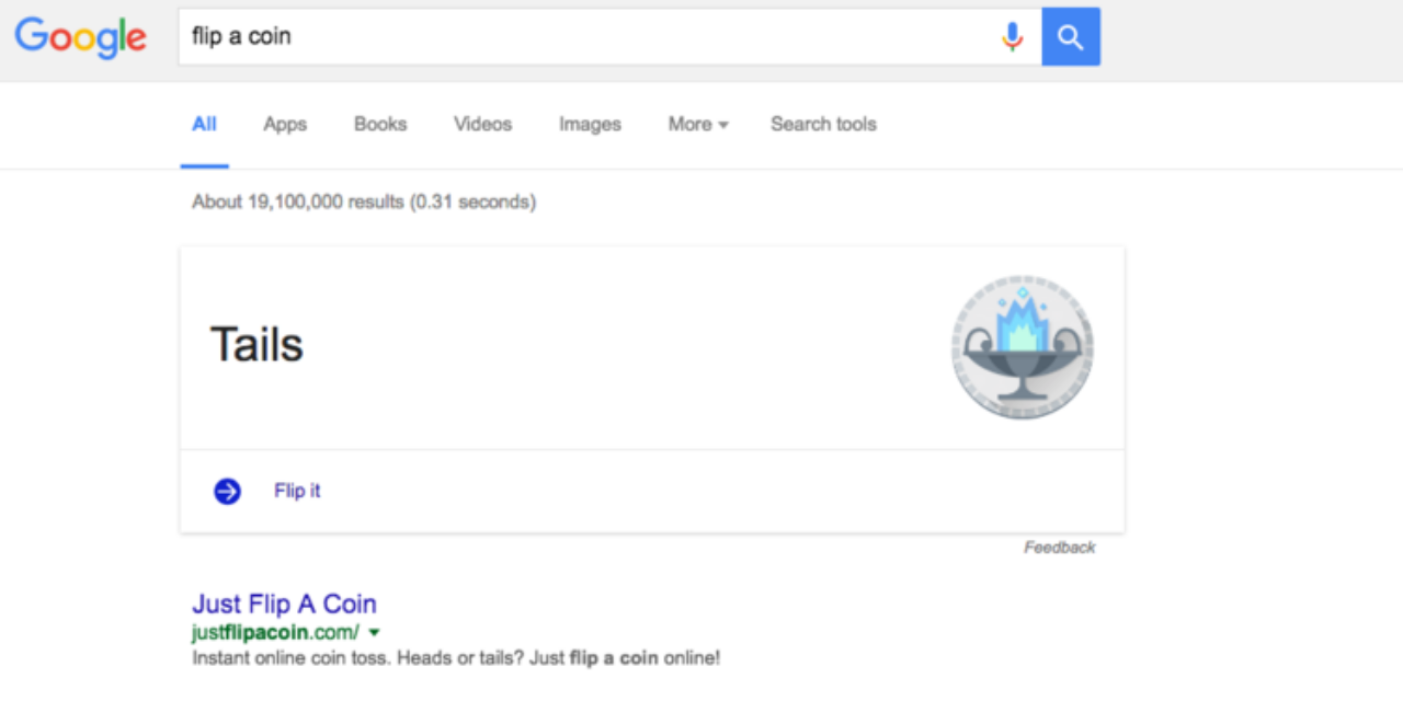 หรือก็คือโยนเหรียญเสี่ยงดวงนั่นแหละ แต่ในเวลาที่เราไม่มีเหรียญจริงๆ พกแต่บัตรเครดิต เราก็สามารถค้นหาคำนี้ ก็จะมีเหรียญมาให้เราหมุนหัว-ก้อยกันแล้ว
