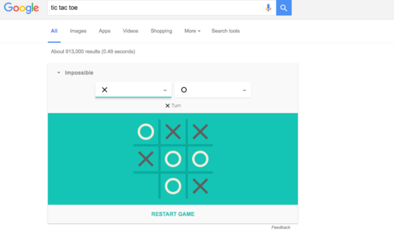 อีกหนึ่งเกมสุดอมตะ tic tac toe หรือ โอเอกซ์ ที่เราขอรับรองว่าไม่มีใครที่ไม่รู้จัก เพราะวิธีเล่นก็แสนง่าย เพียงผู้เล่นแต่ละฝ่ายจะผลัดกันเขียนรูปวงกลม (O) และกากบาท (X) ใครเขียนเครื่องหมายได้เรียงกัน 3 ตัวก่อนจะเป็นผู้ชนะ และเกมนี้ก็เช่นกัน เพียงแค่ใส่ชื่อเกมเข้าไป คุณก็สามารถเล่นกับกูเกิลได้เลย