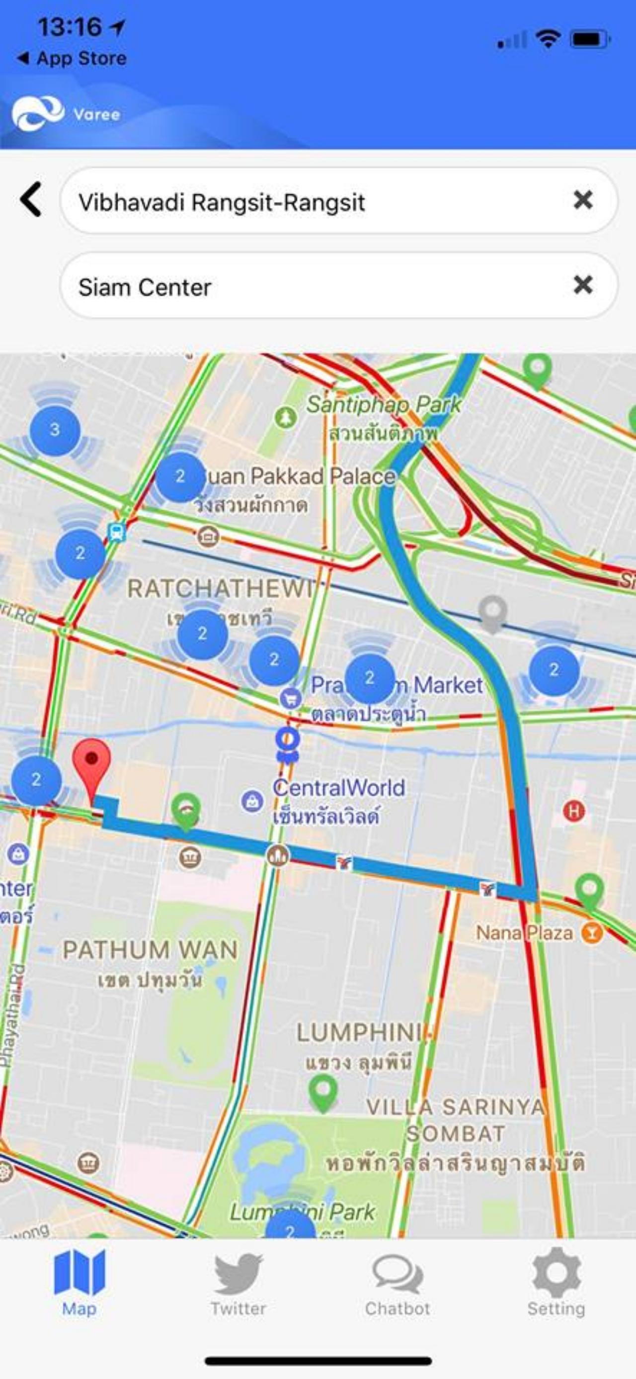 เมื่อเปิดแอปเข้ามา...อย่างแรกที่เจอคือแผนที่ ซึ่งเราสามารถระบุได้ว่าเราอยู่ที่ไหน แล้วต้องการไปที่ไหน แอปก็จะคำนวณสถานการณ์ในตอนนั้นให้