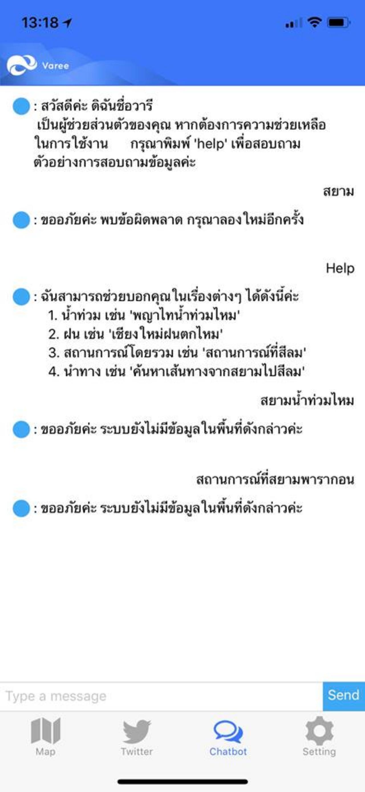 นอกจากนั้นยังสามารถสอบถามสถานการณ์น้ำผ่าน chat bot ได้ แต่อาจจะเพราะยังใหม่อยู่ เวลาถามอะไรไปก็ดูจะเอ๋อๆ งงๆ อยู่บ้าง