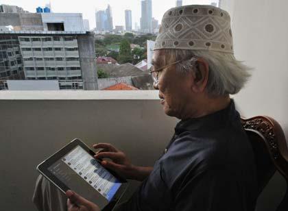 อาหมัด มุสตอฟา บิสรี หรือที่ รู้จักในนามกุสมุส และไค โกล ครูสอนศาสนาชาวมุสลิม ผู้ทรงอิทธิพลและเป็นที่เคารพนับถืออย่างสูงจากองค์การนาฮ์ดลาตุล อูลามา (เอ็นยู) นั่งตรวจดู ความเคลื่อนไหวของเพื่อนในทวิตเตอร์ โดยใช้เครื่องไอแพด ที่กรุงจาการ์ตา สำหรับบิสรีแล้วก็เป็นเช่นเดียวกับผู้นำอิสลามคนอื่น ไม่ว่าหัวอนุรักษ์หรือเสรี นิยม ที่หันมาใช้อินเตอร์เน็ตในการต่อสู้ ด้านศรัทธาในศาสนา ภายในประเทศที่มีประชากรส่วนใหญ่เป็นมุสลิมจำนวนมากที่สุดในโลกอย่างอินโดนีเซีย.