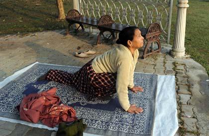 หญิงอินเดียฝึกโยคะภายในสวนสาธารณะนอกกรุงนิวเดลีในขณะที่สมาชิกสภาผู้แทนราษฎรกำลังล็อบบี้ให้มีการออกกฎหมายบังคับให้มีวิชาโยคะสำหรับเด็กนักเรียนประถมศึกษา เพื่อช่วยสร้างเสริมให้เด็กมีวินัย ให้มีร่างกายแข็งแรง และต่อกรกับ "อาการเครียดจากคอมพิวเตอร์ได้".