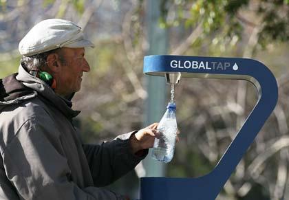 ชายนายนี้นำขวดน้ำมาเติมน้ำก๊อกจากสถานีเติมน้ำของ "โกลบอล แทป" ที่เพิ่งติดตั้งใหม่ ในซานฟรานซิสโก รัฐแคลิฟอร์เนีย สหรัฐอเมริกา ที่เห็นในภาพเป็นสถานีเติมน้ำ แห่งใหม่ 1 ใน 7 แห่งที่โกลบอล แทป แอลแอลซี ออกแบบให้นำขวดมาเติมน้ำได้ง่ายขึ้น โดยคณะกรรมการการใช้ประโยชน์สาธารณะซานฟรานซิสโก หวังว่าจะช่วยให้คนนำขวดกลับมาใช้เติมน้ำใหม่ แทน ที่จะมีการซื้อน้ำขวดราคาแพง.